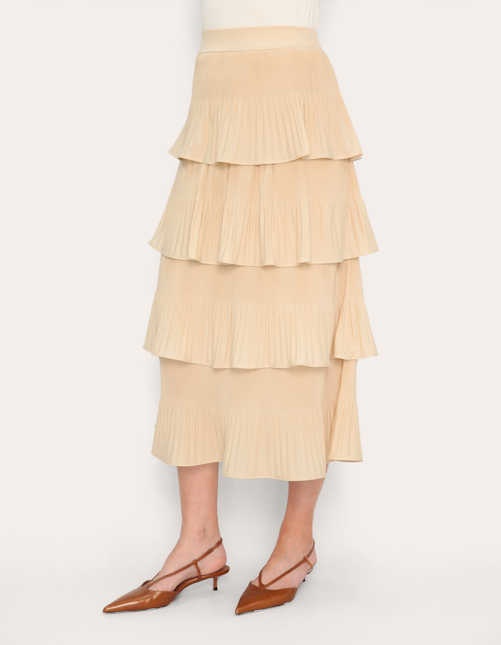 Com movimento e drama suave, esta saia midi em camadas plissadas tem volume e fluidez na medida certa. A textura ondulada e o tom preto criam um visual sofisticado com presença marcante.