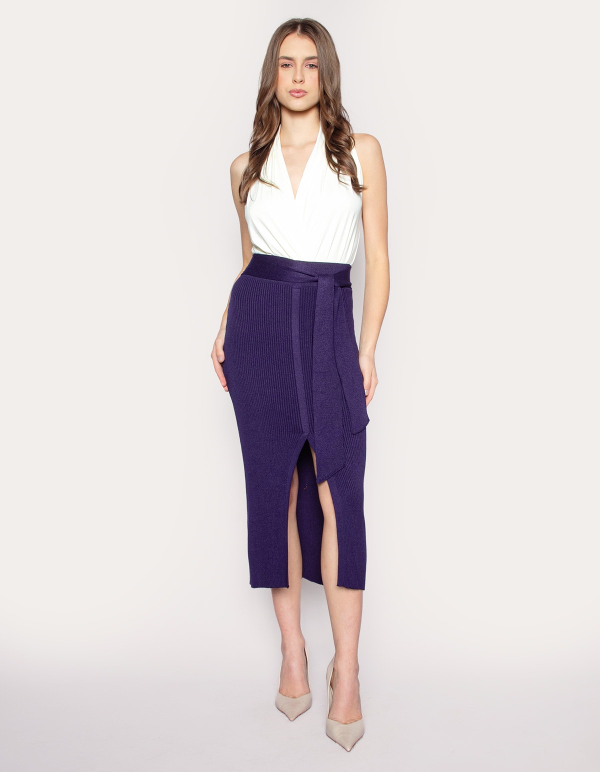Saia midi tricot com faixa embutida e fenda frontal. modelagem reta. para um look elegante e fashonista.