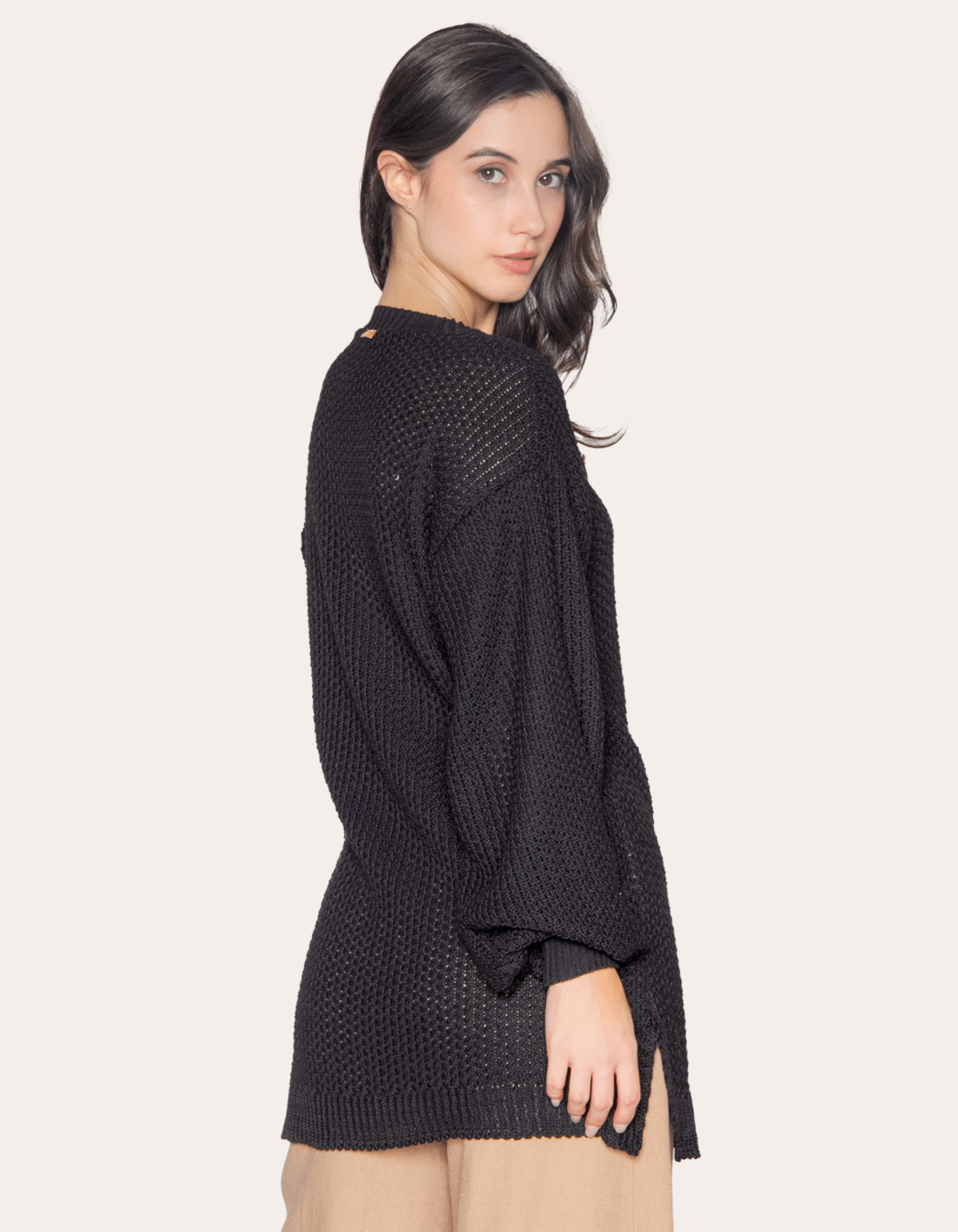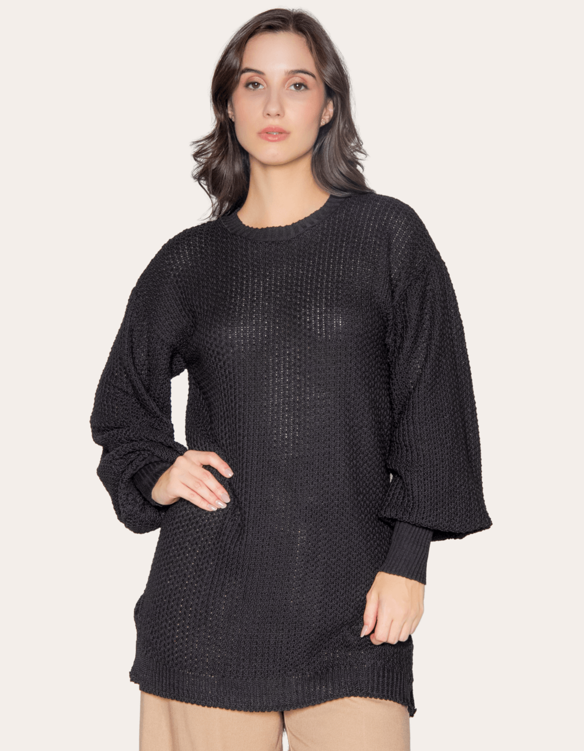 Blusão suéter tricot é aquele básico diferenciado que você vai querer usar de segunda a segunda. com comprimento alongado, silhueta oversized, gola redonda e mangas longas bufantes. perfeito para arrasar no inverno com muito estilo.