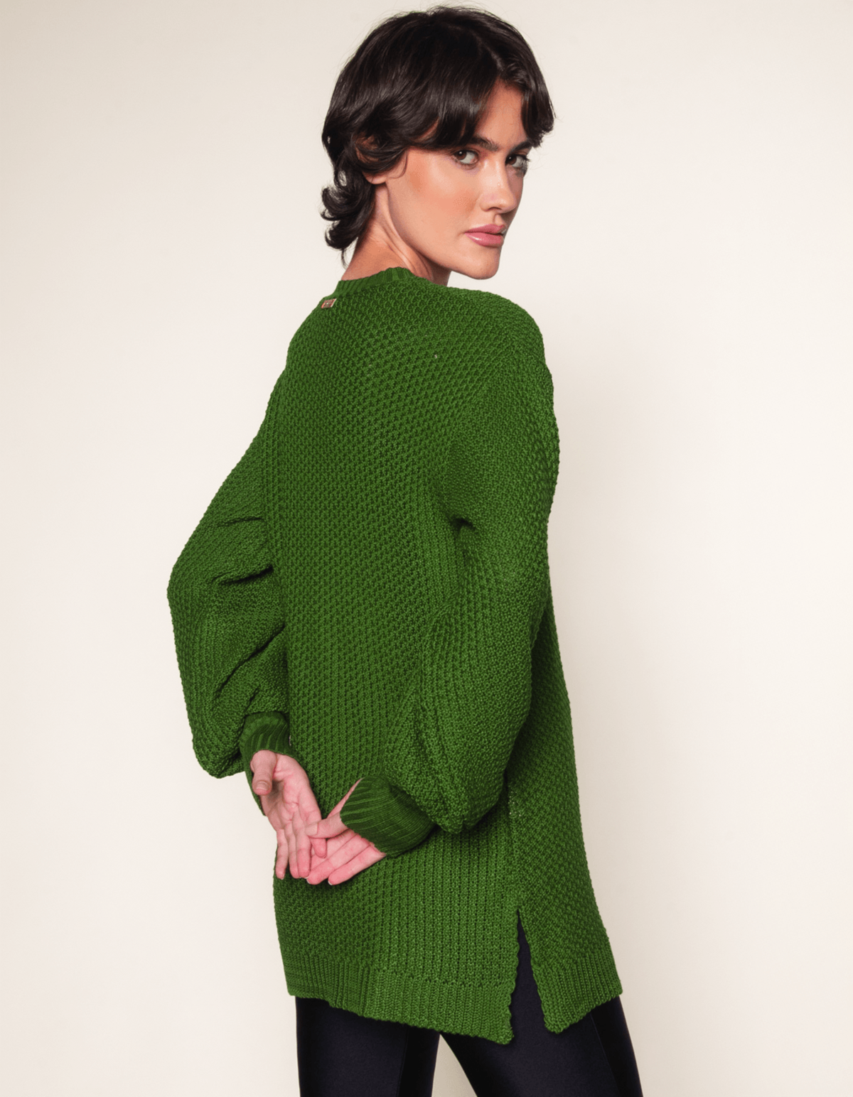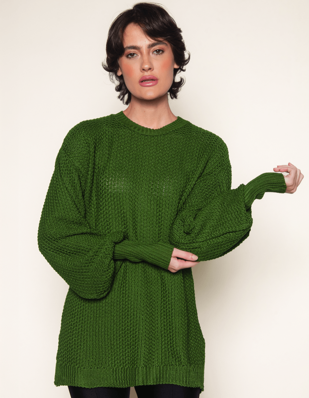 Blusão suéter tricot é aquele básico diferenciado que você vai querer usar de segunda a segunda. com comprimento alongado, silhueta oversized, gola redonda e mangas longas bufantes. perfeito para arrasar no inverno com muito estilo.