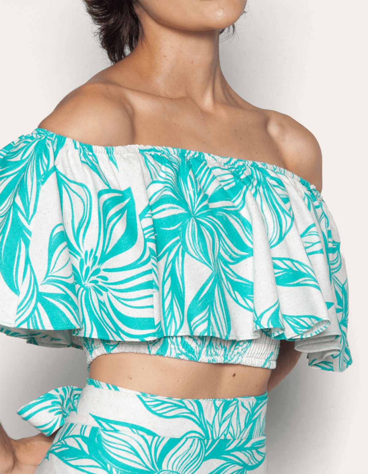 blusa cropped, decote ombro a ombro, estilo ciganinha, babadinho, lastex nas costas. indispensável no guarda-roupas pois é uma peça versátil e fácil de combinar nos looks.