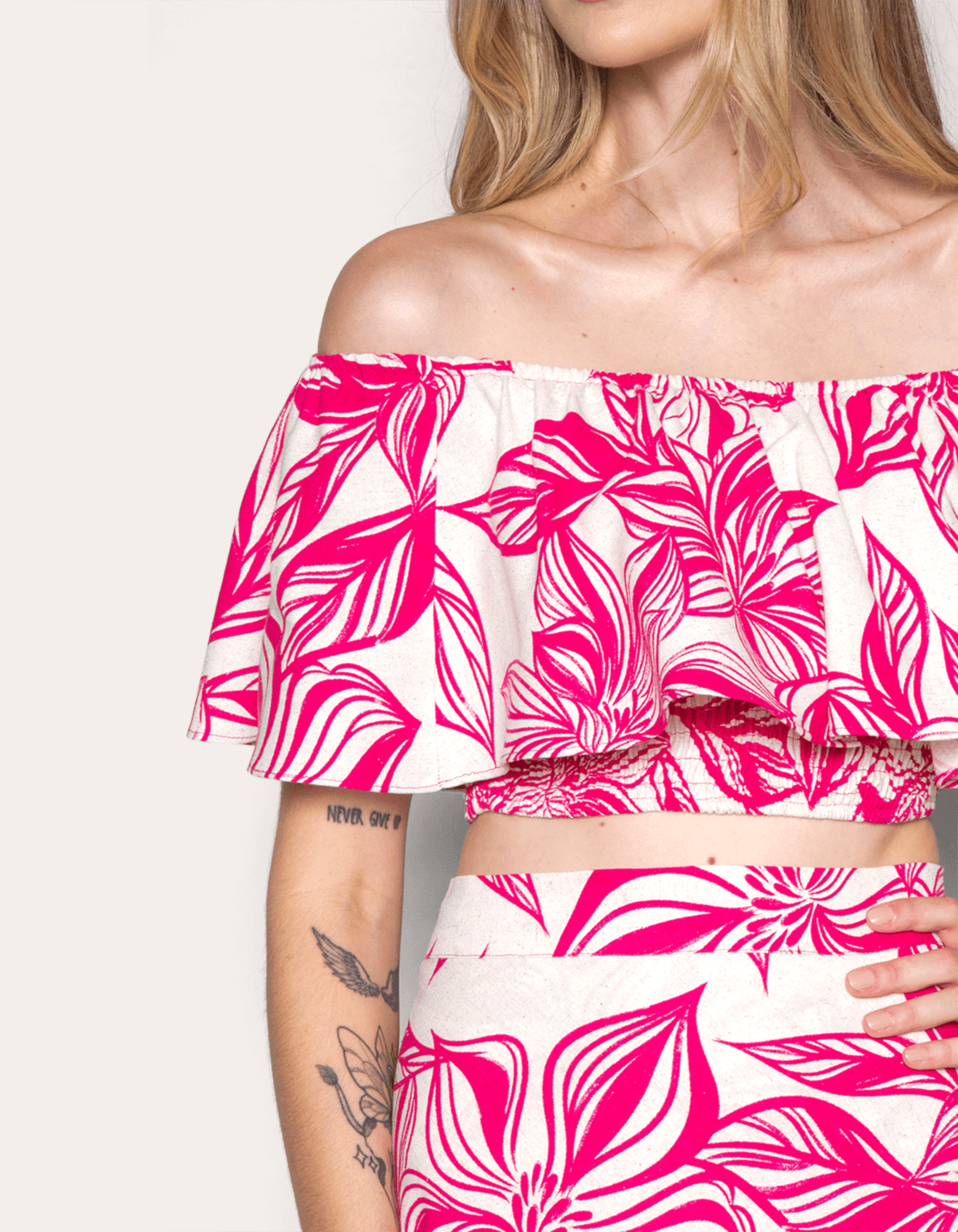 blusa cropped, decote ombro a ombro, estilo ciganinha, babadinho, lastex nas costas. indispensável no guarda-roupas pois é uma peça versátil e fácil de combinar nos looks.