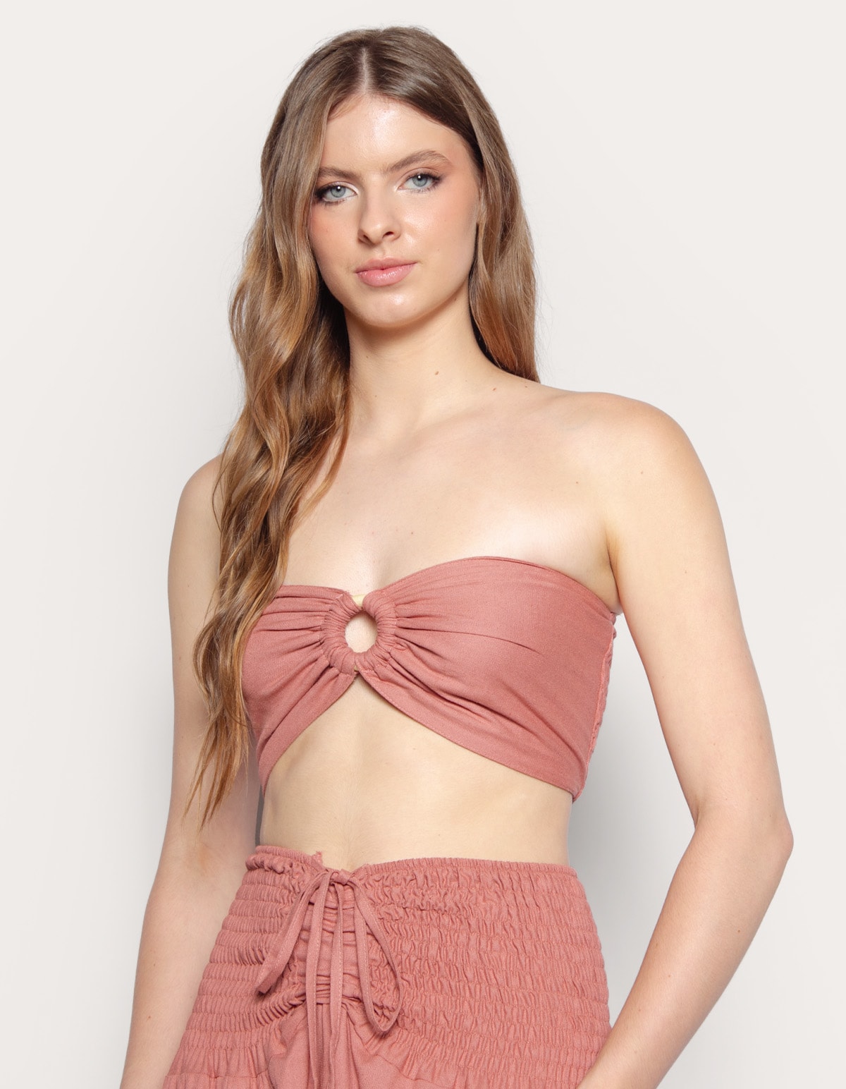 Top faixa tomara que caia com argola. Cobre o busto de forma justa, com design drapeado concentrado na parte central do busto e preso por uma argola. Com lastex atrás, ele pode se ajustar ao corpo. Moderno e jovial e com um ponto focal elegante criado pelo drapeado e detalhe da argola central. Pode ser usado em diversos looks, dependendo da ocasião, com calças e shorts de cintura alta ou com uma camisa oversized aberta.