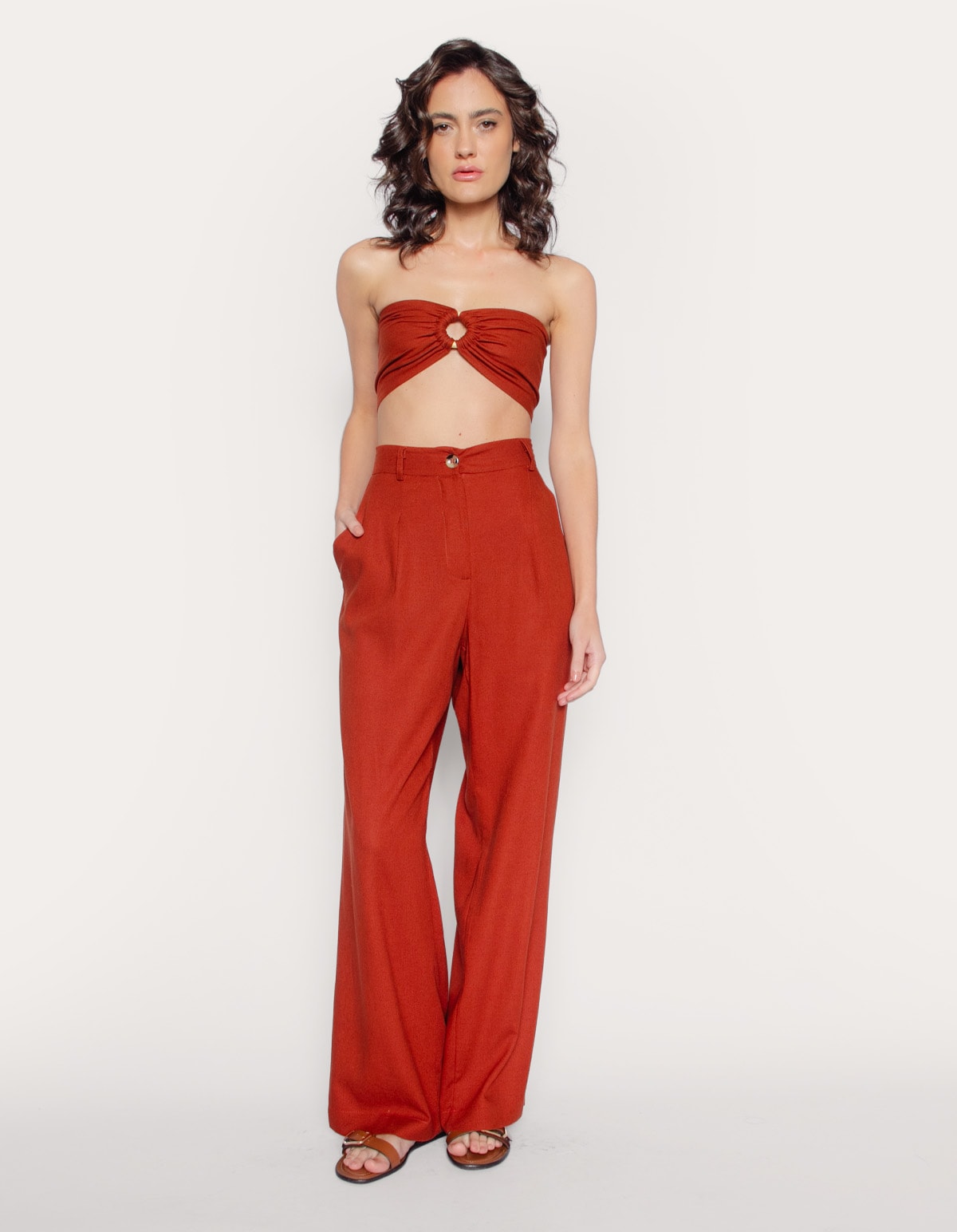 Top faixa tomara que caia com argola. Cobre o busto de forma justa, com design drapeado concentrado na parte central do busto e preso por uma argola. Com lastex atrás, ele pode se ajustar ao corpo. Moderno e jovial e com um ponto focal elegante criado pelo drapeado e detalhe da argola central. Pode ser usado em diversos looks, dependendo da ocasião, com calças e shorts de cintura alta ou com uma camisa oversized aberta.