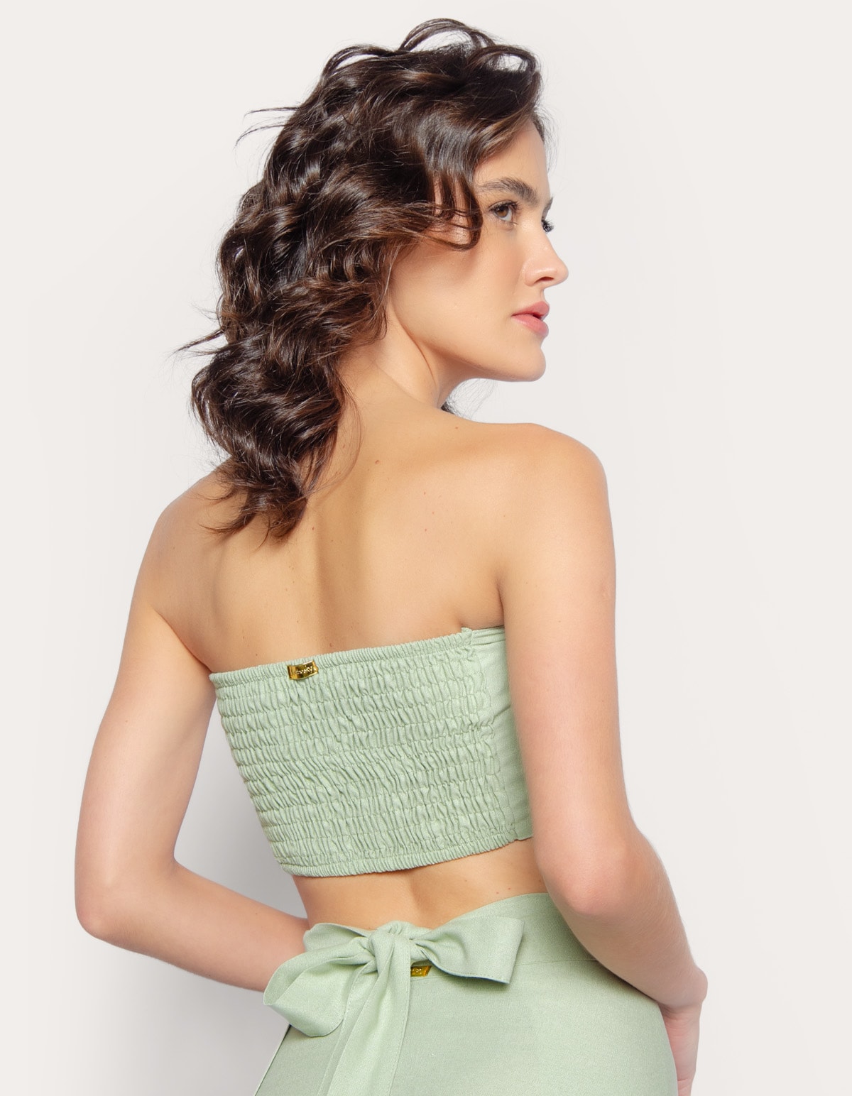 Top faixa tomara que caia com argola. Cobre o busto de forma justa, com design drapeado concentrado na parte central do busto e preso por uma argola. Com lastex atrás, ele pode se ajustar ao corpo. Moderno e jovial e com um ponto focal elegante criado pelo drapeado e detalhe da argola central. Pode ser usado em diversos looks, dependendo da ocasião, com calças e shorts de cintura alta ou com uma camisa oversized aberta.