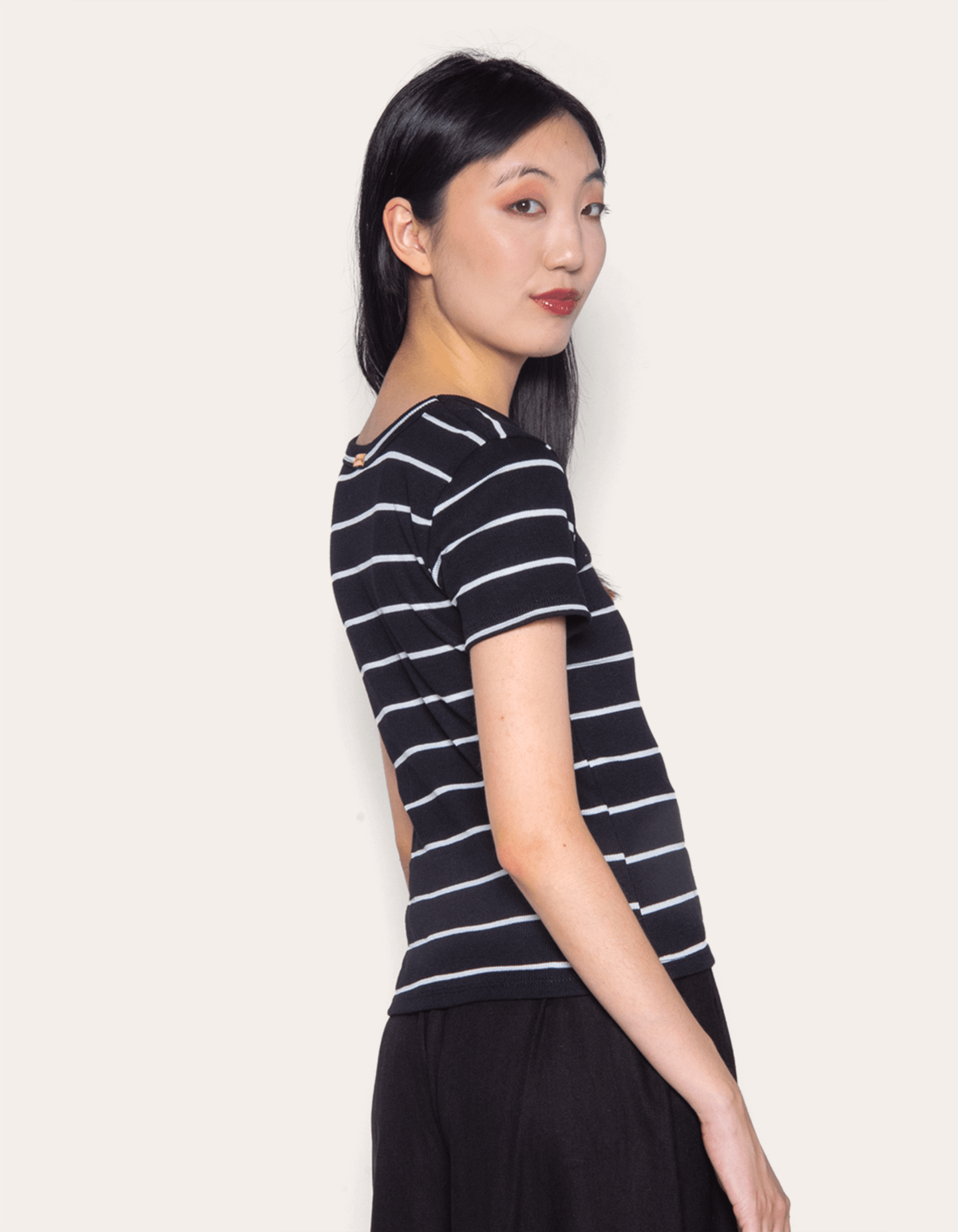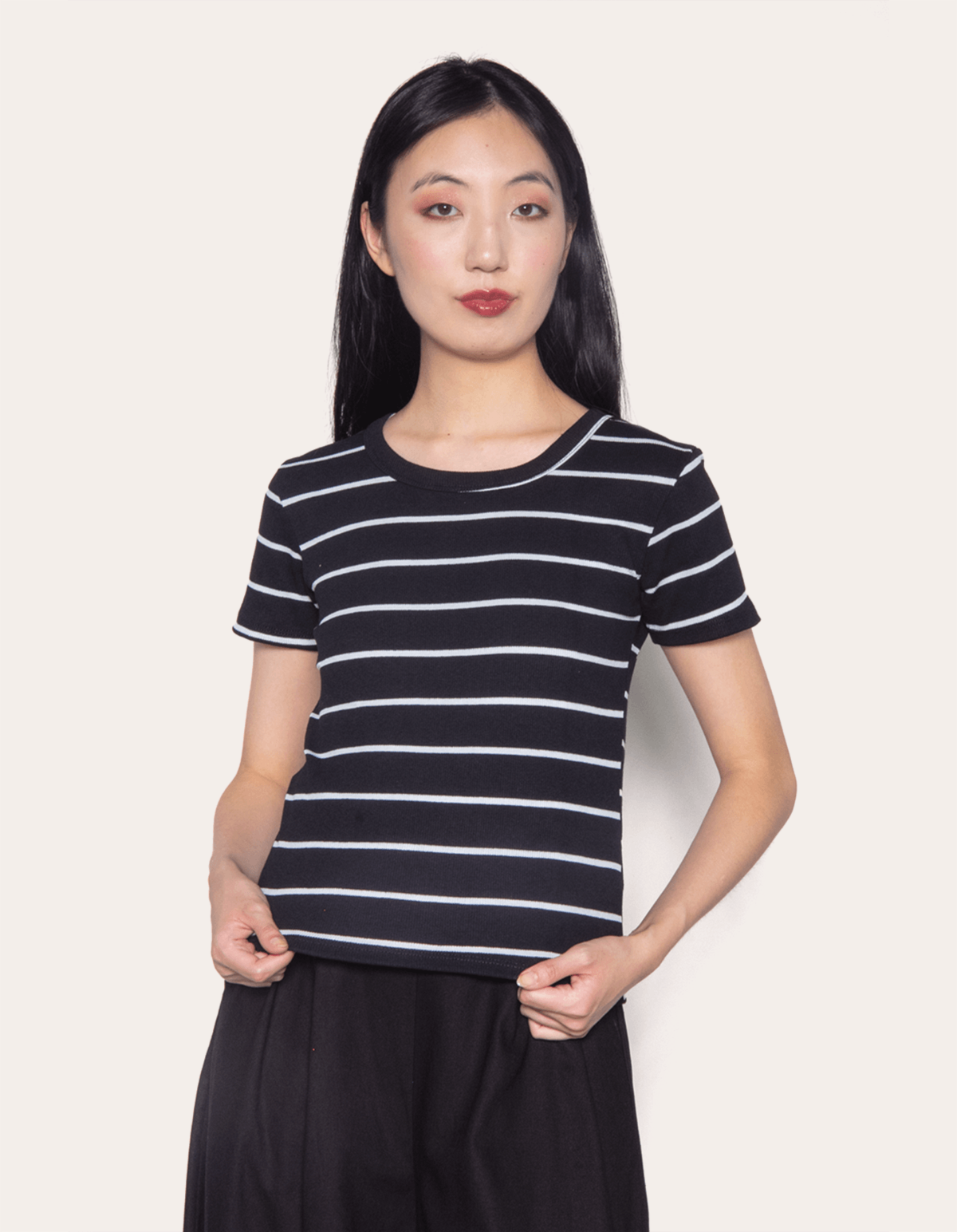 Uma peça que exala elegância e conforto, feita em um tecido canelado, essa blusa oferece uma modelagem ajustada que abraça a silhueta de maneira sofisticada, com o padrão listrado confere um visual moderno e atemporal, permitindo diversas combinações e estilos, conta com as mangas curtas e gola redonda. ideal para criar looks versáteis, ela pode ser facilmente combinada com jeans para um visual casual ou com uma saia para uma produção mais elaborada.