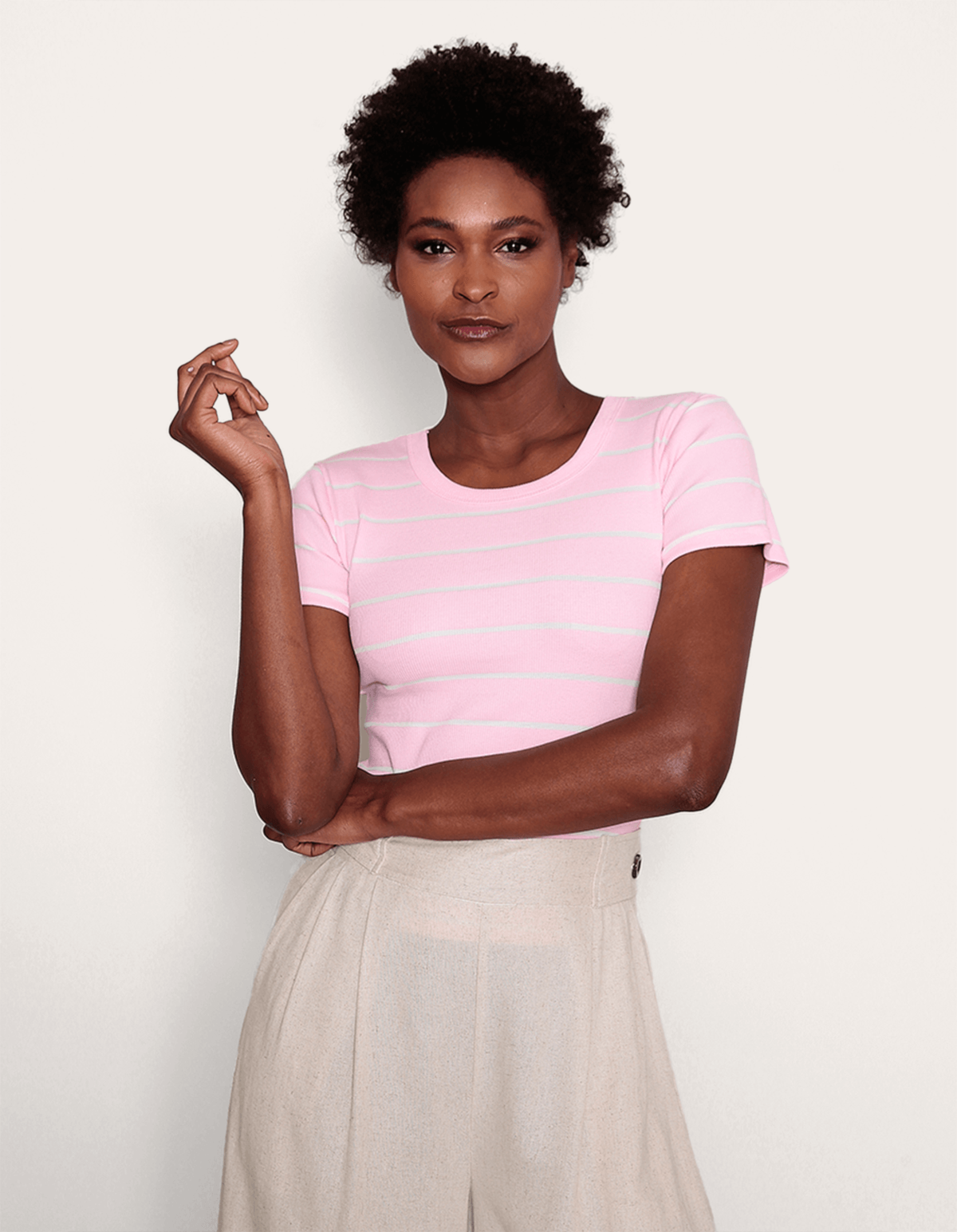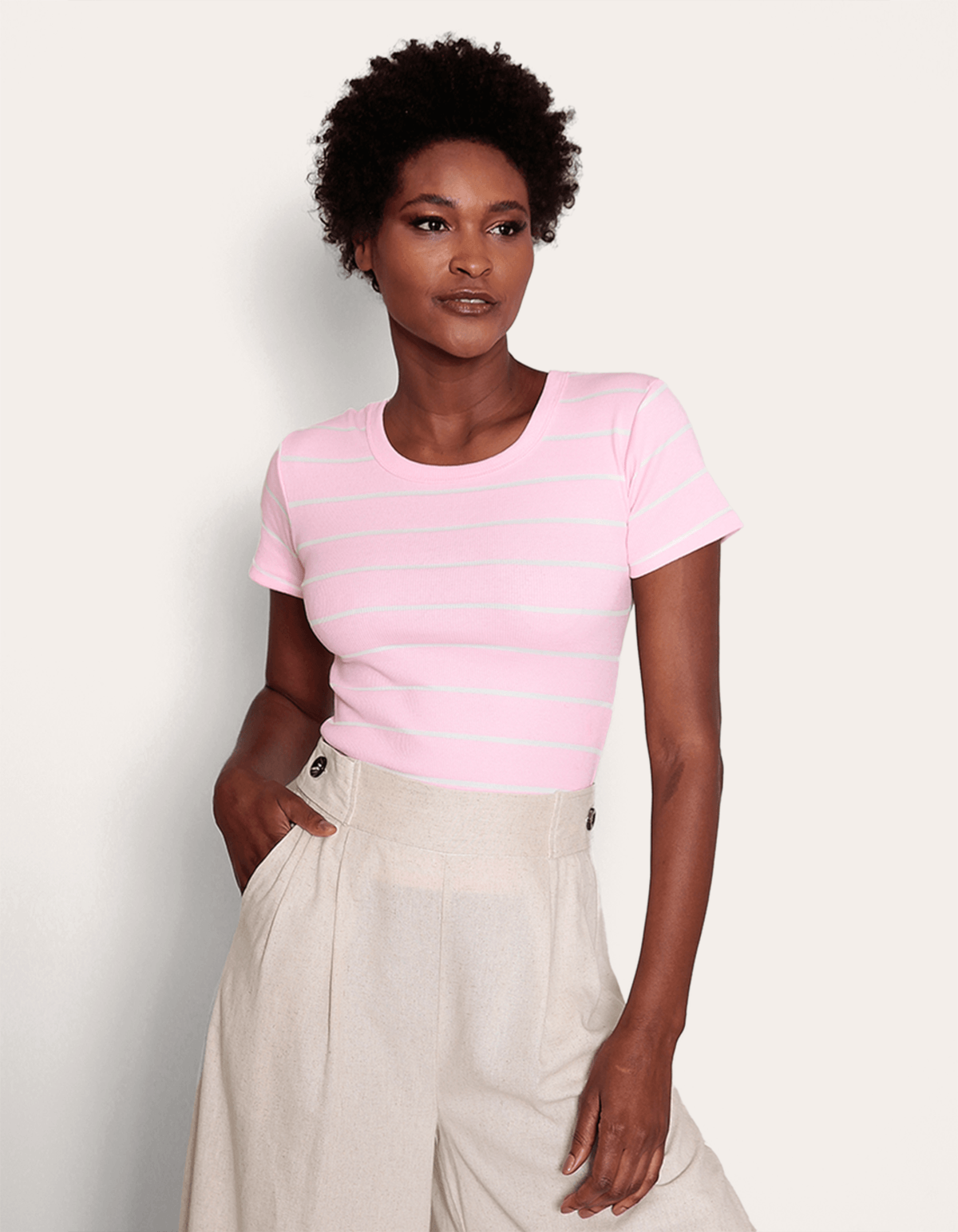 Uma peça que exala elegância e conforto, feita em um tecido canelado, essa blusa oferece uma modelagem ajustada que abraça a silhueta de maneira sofisticada, com o padrão listrado confere um visual moderno e atemporal, permitindo diversas combinações e estilos, conta com as mangas curtas e gola redonda. ideal para criar looks versáteis, ela pode ser facilmente combinada com jeans para um visual casual ou com uma saia para uma produção mais elaborada.