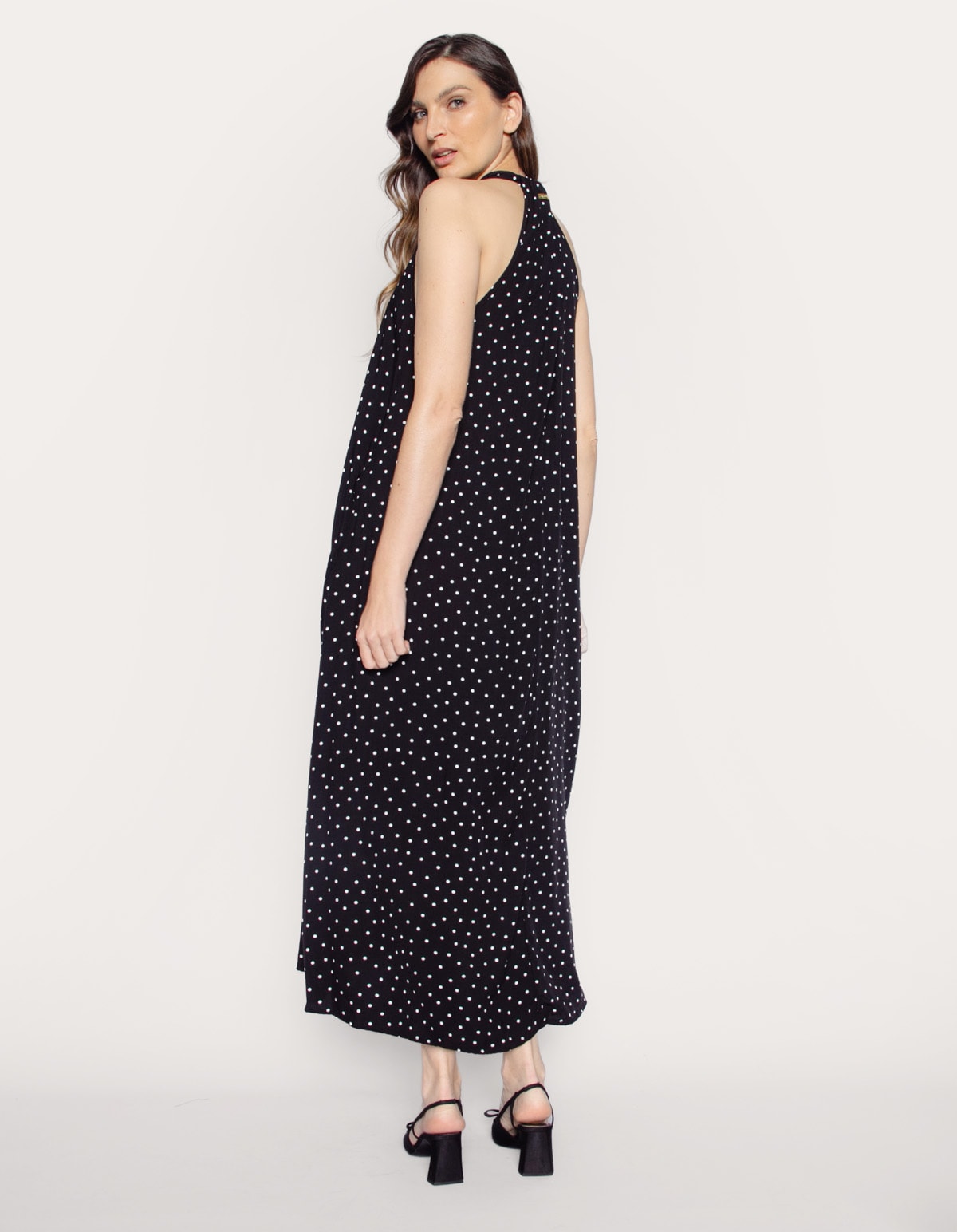 Vestido longo amplo cavado, modelagem evasê com caimento fluido e solto no corpo que porporciona conforto e movimento, decote v preso no pescoço dando impressão de ser frente única, mas não é. A frente deixa os ombros e maior parte das costas a mostra, oferecendo um visual elegante e sensual. De caimento leve e esvoaçante, o modelo é ideal para o verão, perfeito para eventos diurnos, coquetéis de verão ou passeios casuais chiques, combinando a atemporalidade do poá com a modernidade e frescor da modelagem ampla.