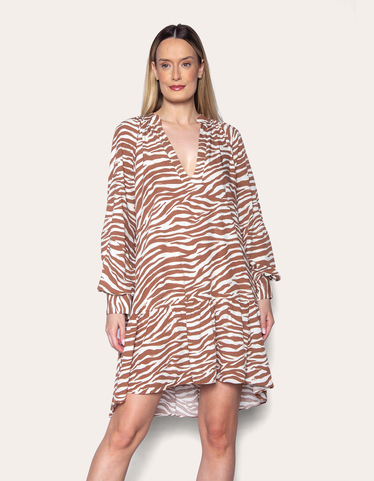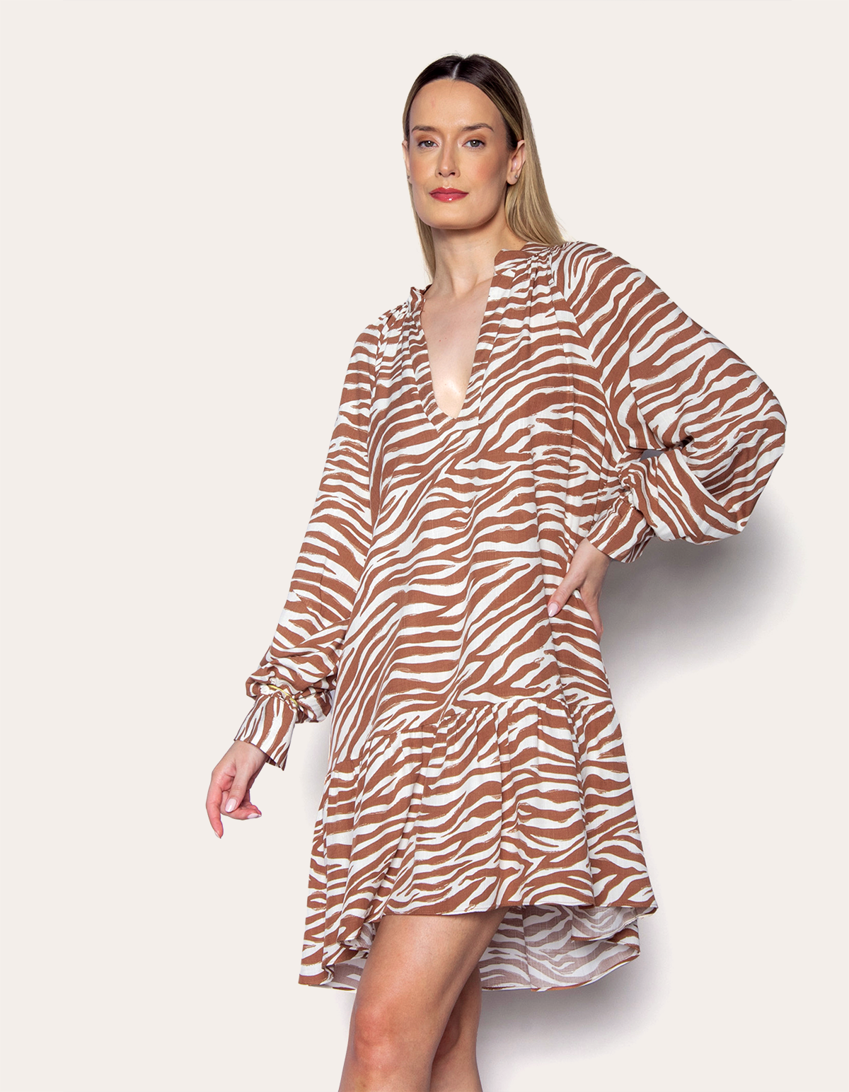 Vestido curto, manga longa, modelagem ampla e decote v. Uma peça linda, atemporal e extremamente confortável!
