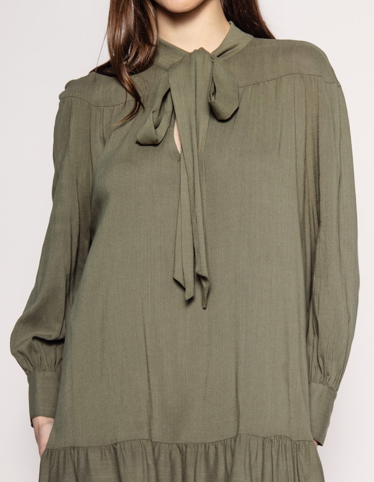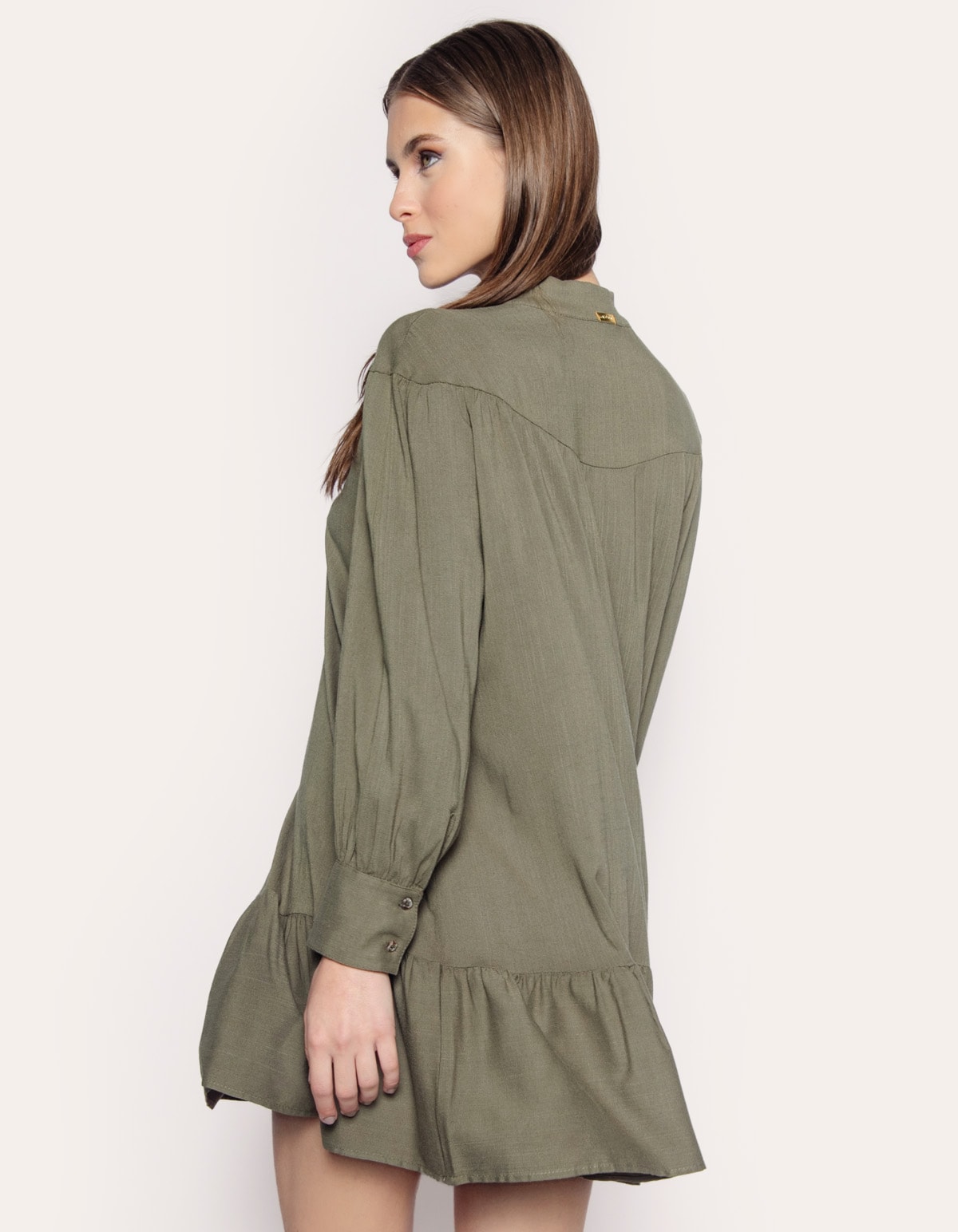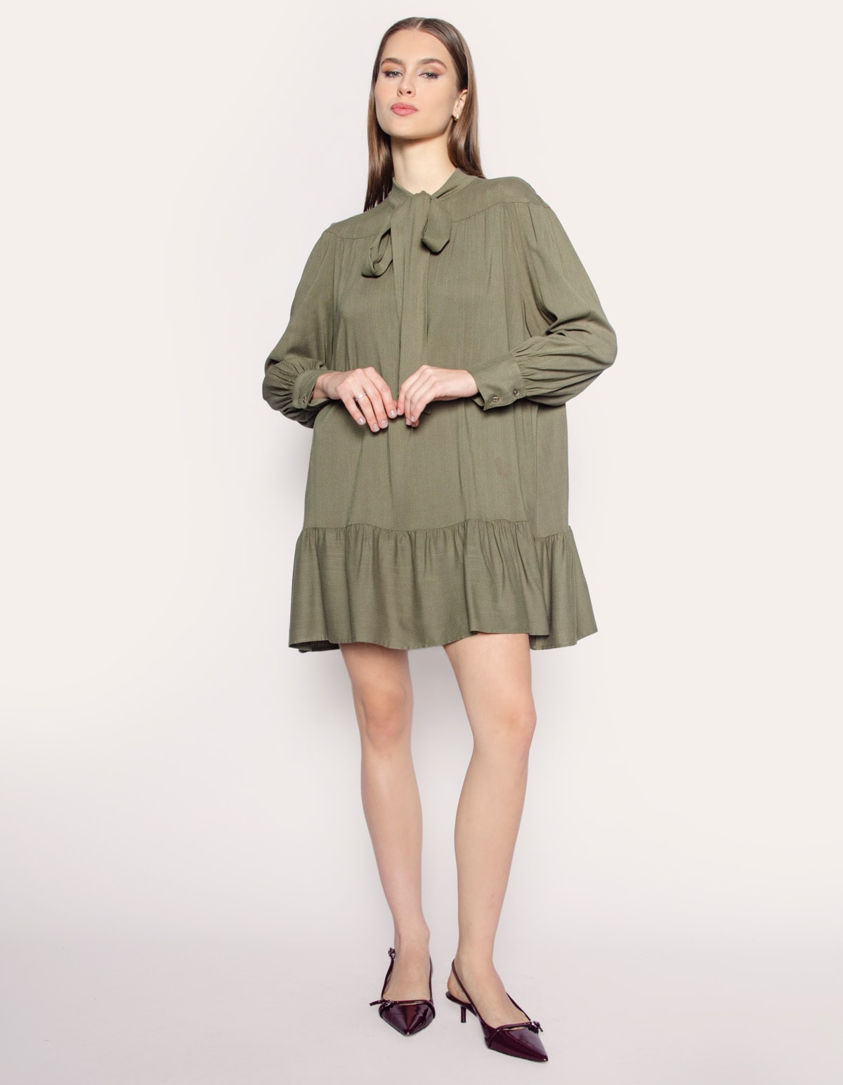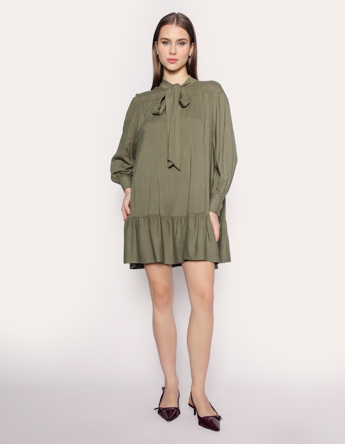 Vestido curto manga longa, gola com faixa embutida para laço e babado na barra. Uma peça feminina e cheia de estilo para adicionar ao seu guarda-roupa. Com sua combinação de elementos românticos e modernos, este vestido é perfeito para criar looks encantadores e elegantes.