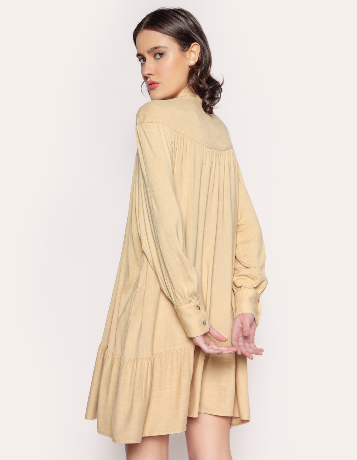 Vestido curto manga longa, gola com faixa embutida para laço e babado na barra. Uma peça feminina e cheia de estilo para adicionar ao seu guarda-roupa. Com sua combinação de elementos românticos e modernos, este vestido é perfeito para criar looks encantadores e elegantes.