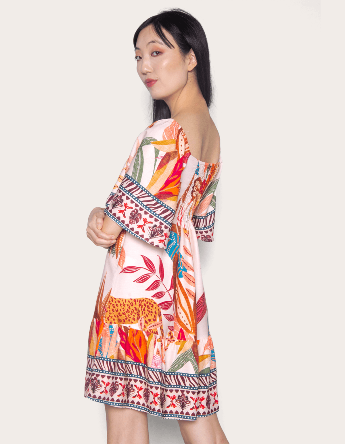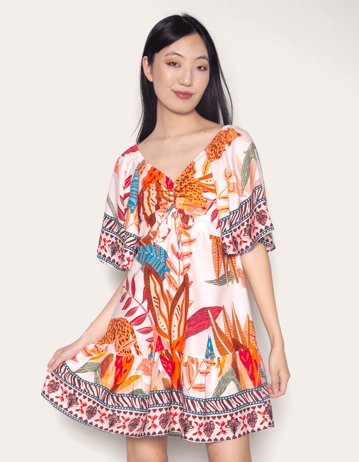 Vestido curto, manga godê, ajuste no decote para franzir. fluido e prático, é ideal para o dia a dia.