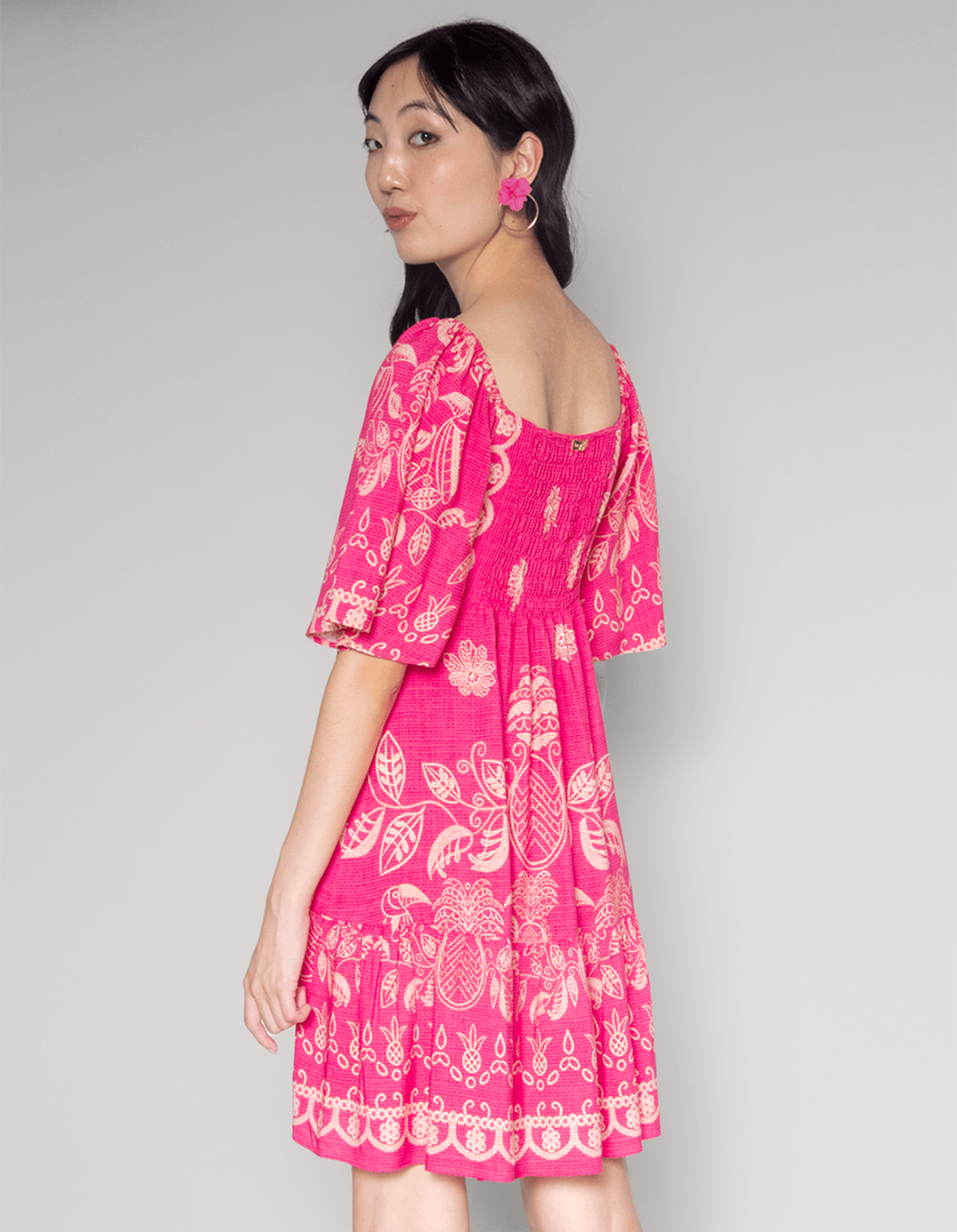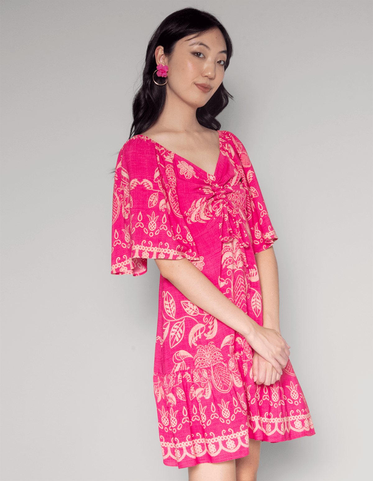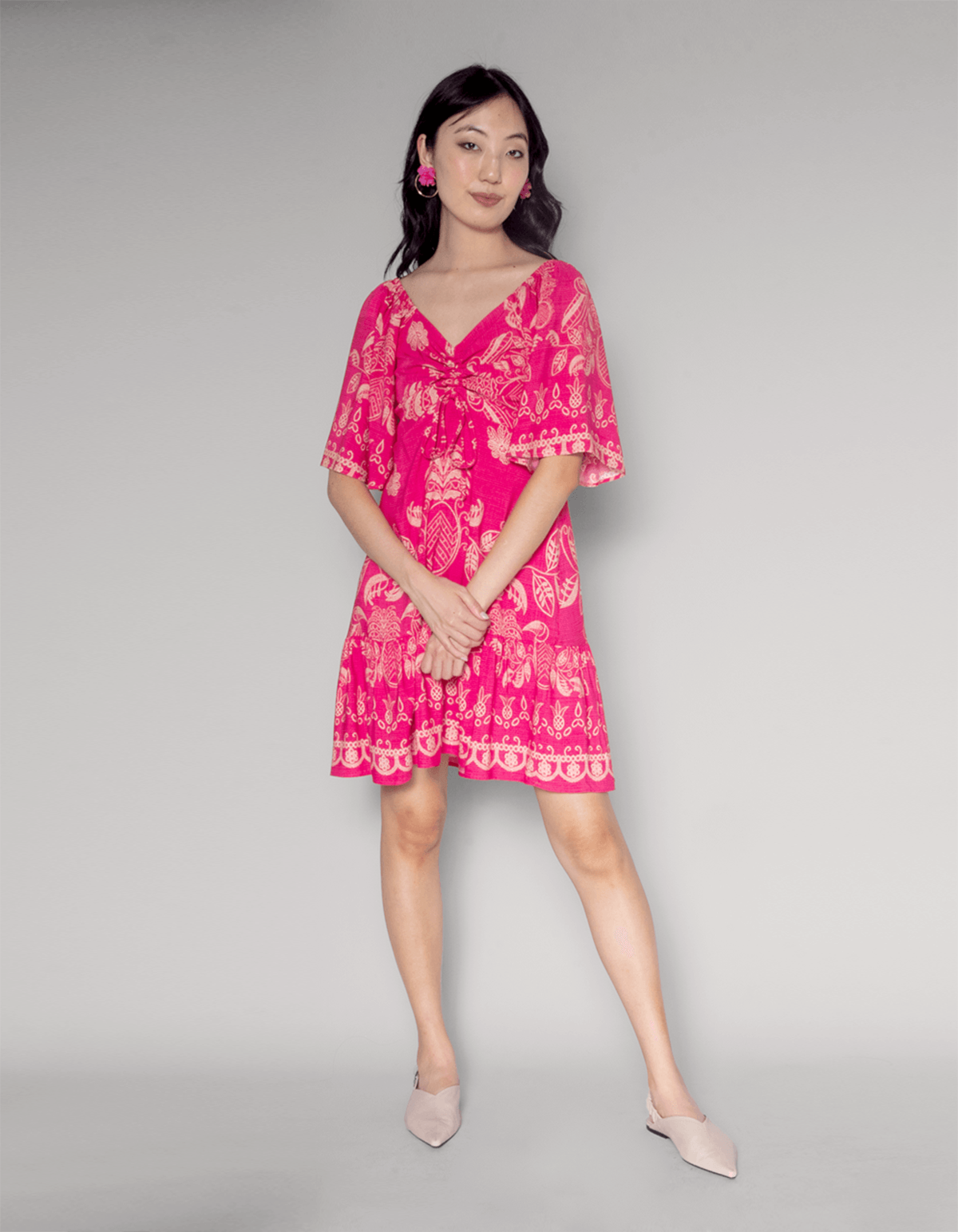 Vestido curto, manga godê, ajuste no decote para franzir. fluido e prático, é ideal para o dia a dia.