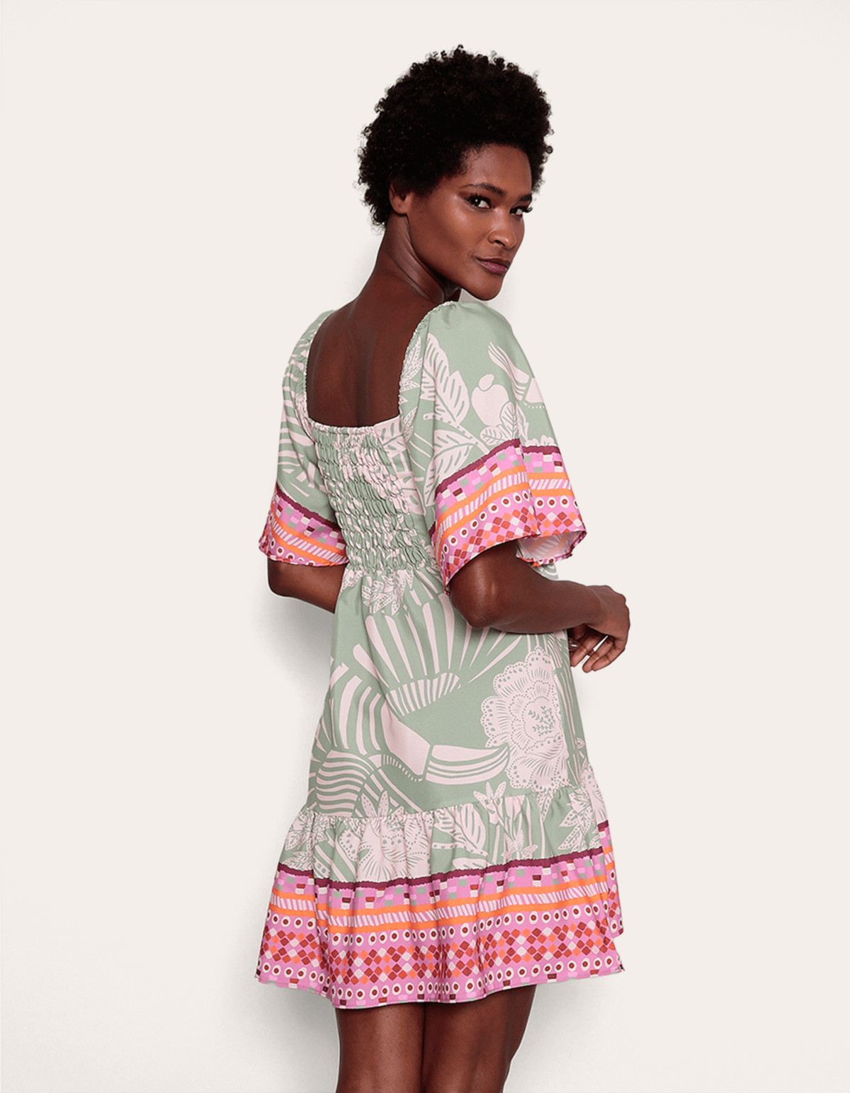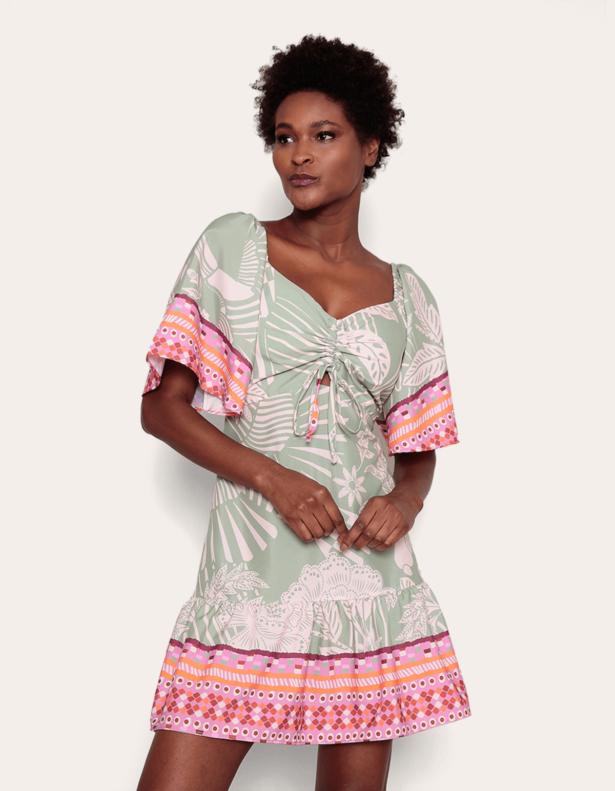 Vestido curto, manga godê, ajuste no decote para franzir. fluido e prático, é ideal para o dia a dia.