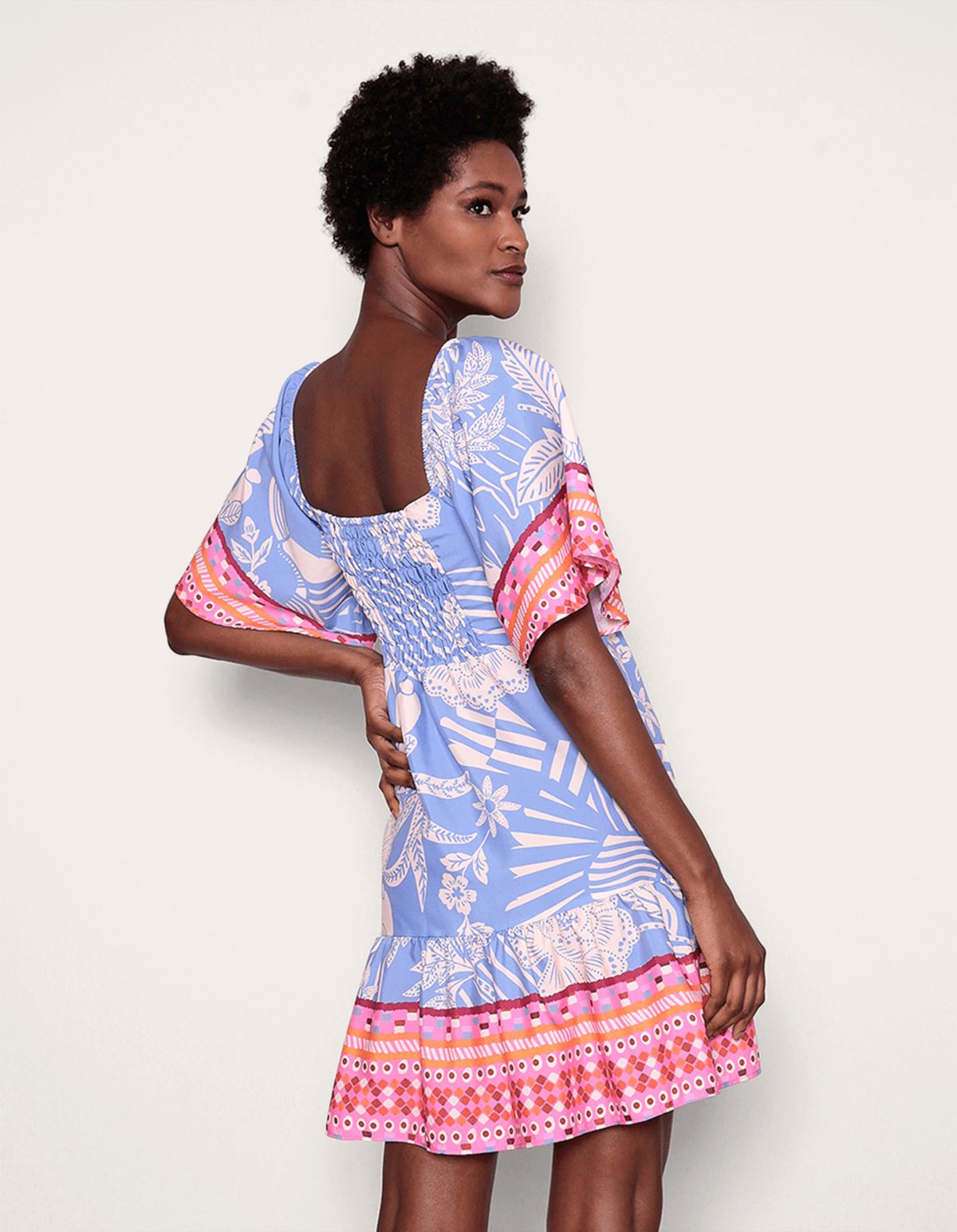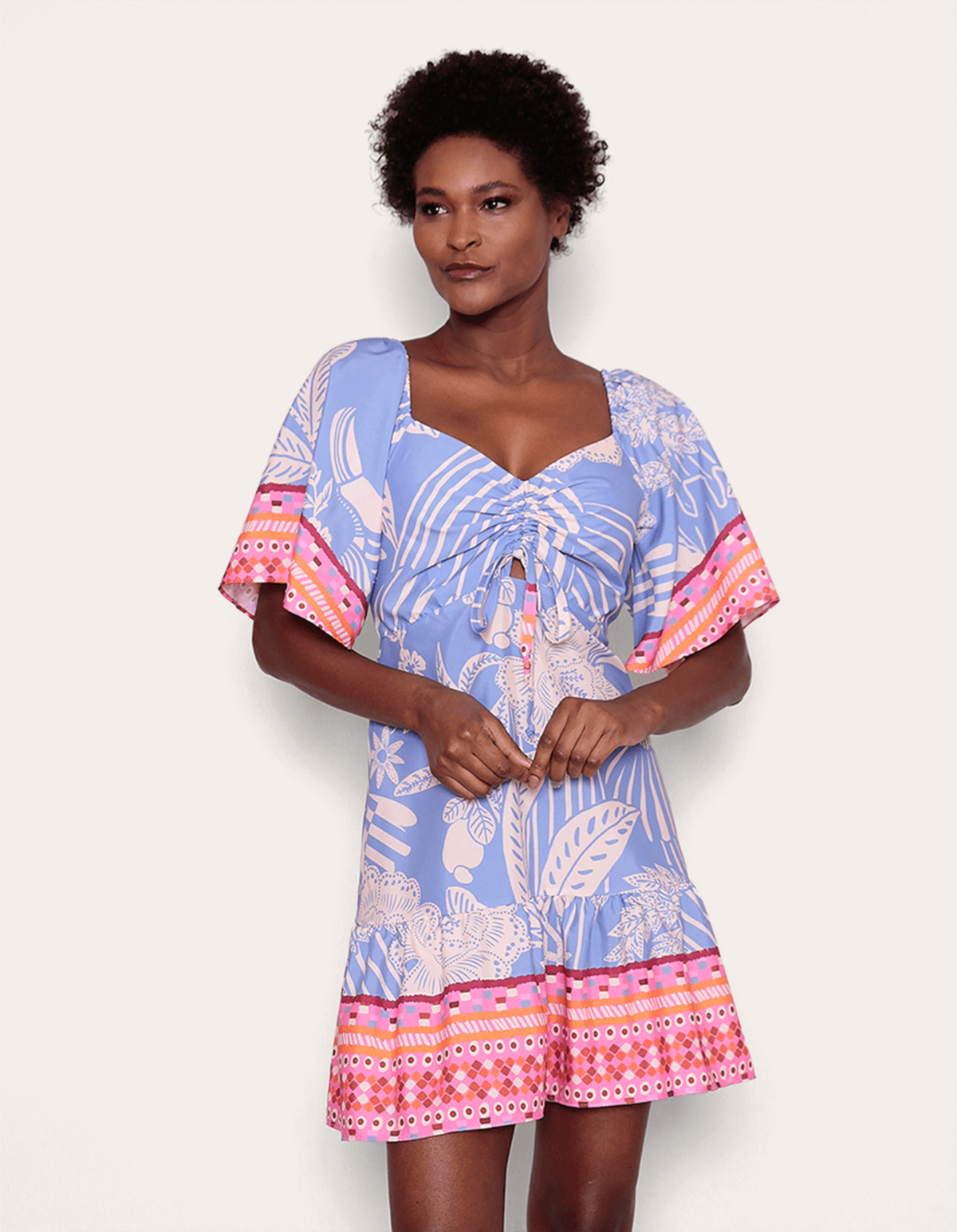 Vestido curto, manga godê, ajuste no decote para franzir. fluido e prático, é ideal para o dia a dia.