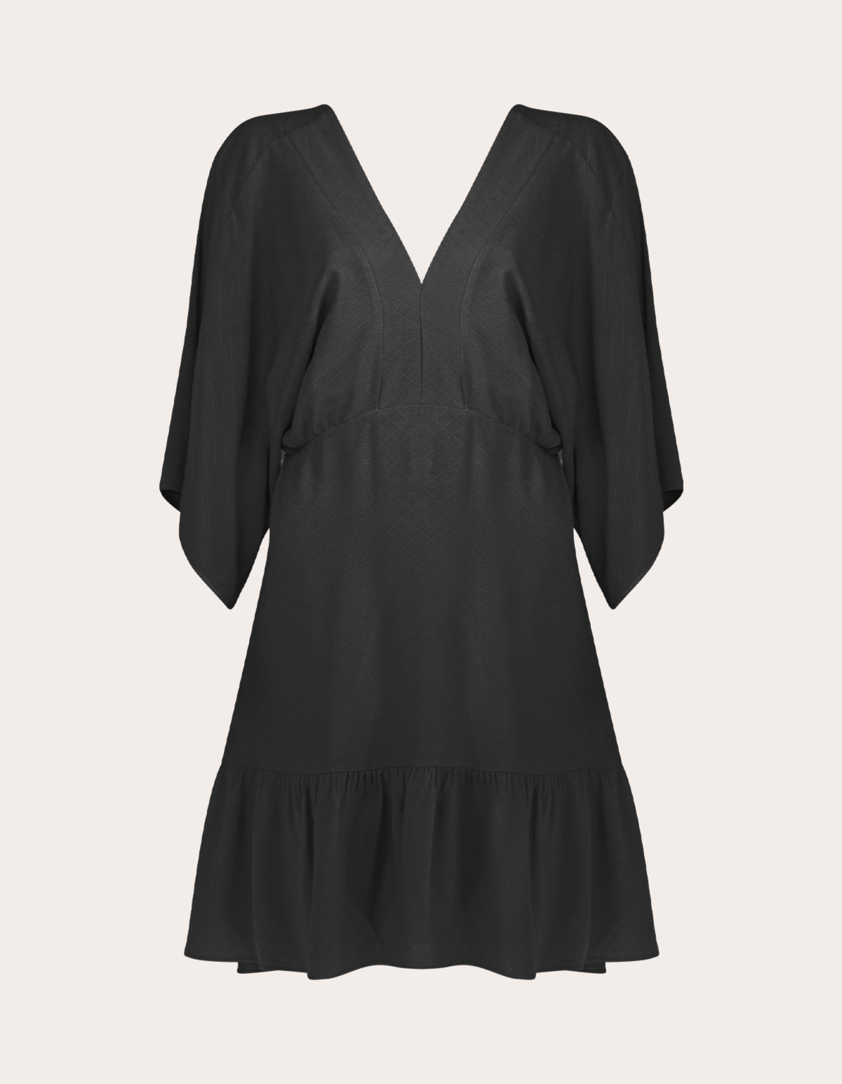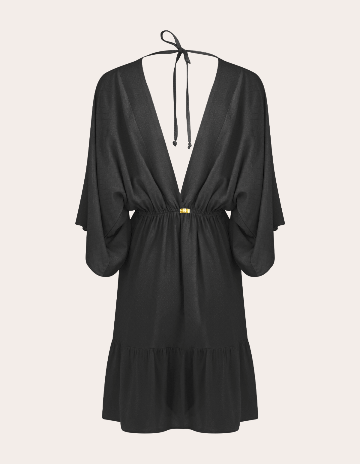 Vestido curto decote v, manga curta ampla, com viés para amarrar atrás e elástico na cintura atrás, barra com babado. com um corte fluído, proporciona conforto sem comprometer o estilo. seu design versátil é acentuado por detalhes únicos, tornando-o uma peça elegante para diversas ocasiões.