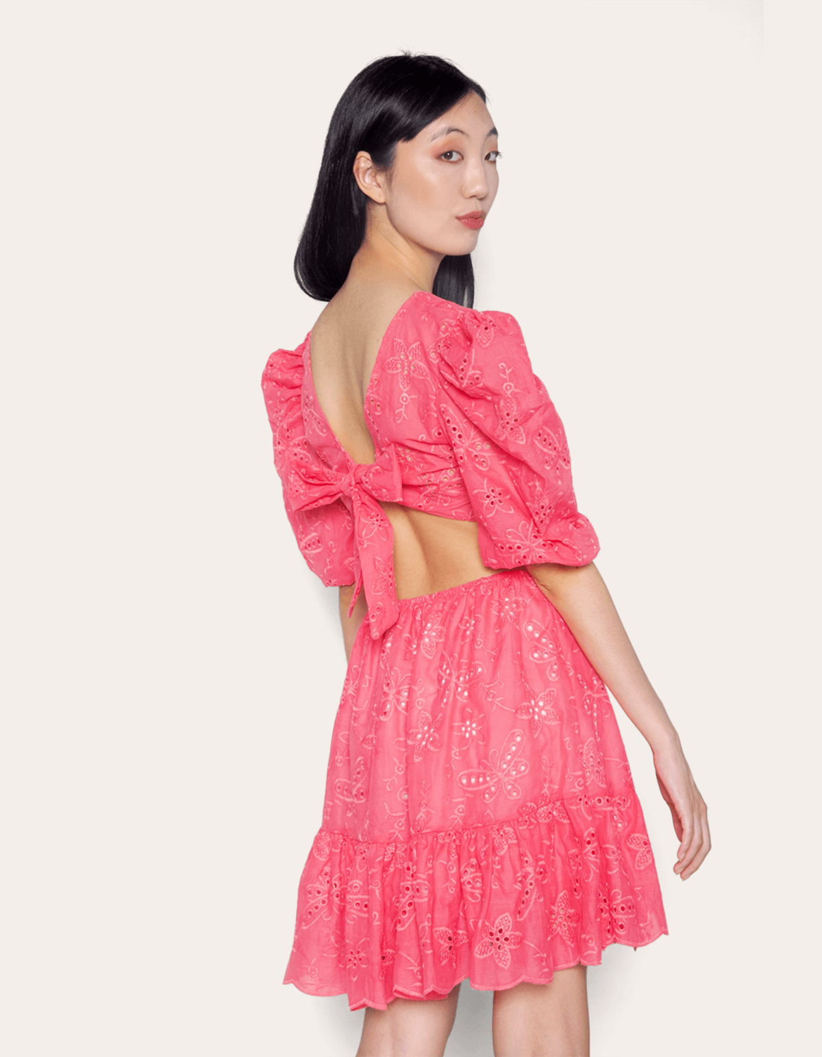 Vestido curto de laise, possui argola frontal, decote em v, recortes vazados na cintura e mangas bufantes com elástico. com elástico nas costas (cintura) e fechamento por amarração. uma opção certeira para eventos de dia.