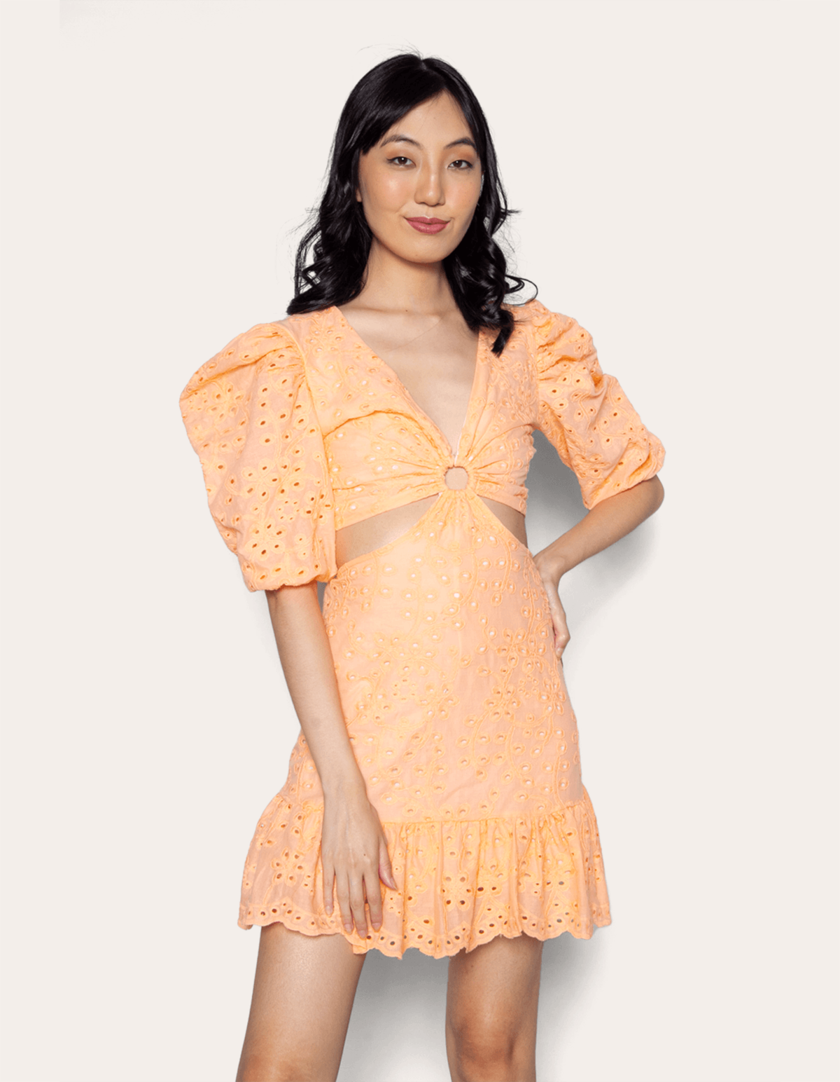 Vestido curto de laise, possui argola frontal, decote em v, recortes vazados na cintura e mangas bufantes com elástico. com elástico nas costas (cintura) e fechamento por amarração. uma opção certeira para eventos de dia.