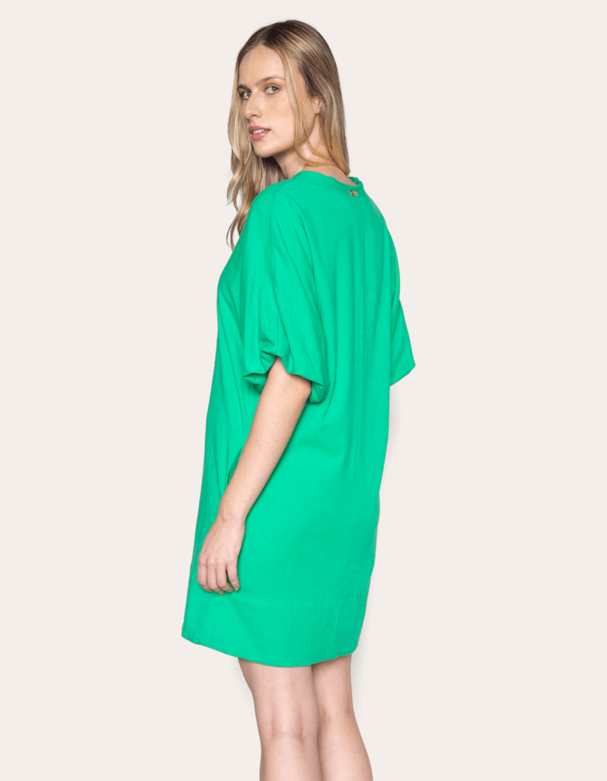 Vestido curto decote v, modelagem reta, manga curta bufante com elástico, possui bolsos faca nas laterais. proporciona uma aparência delicada e contemporânea. uma peça refinada e aconchegante, perfeita para várias ocasiões.