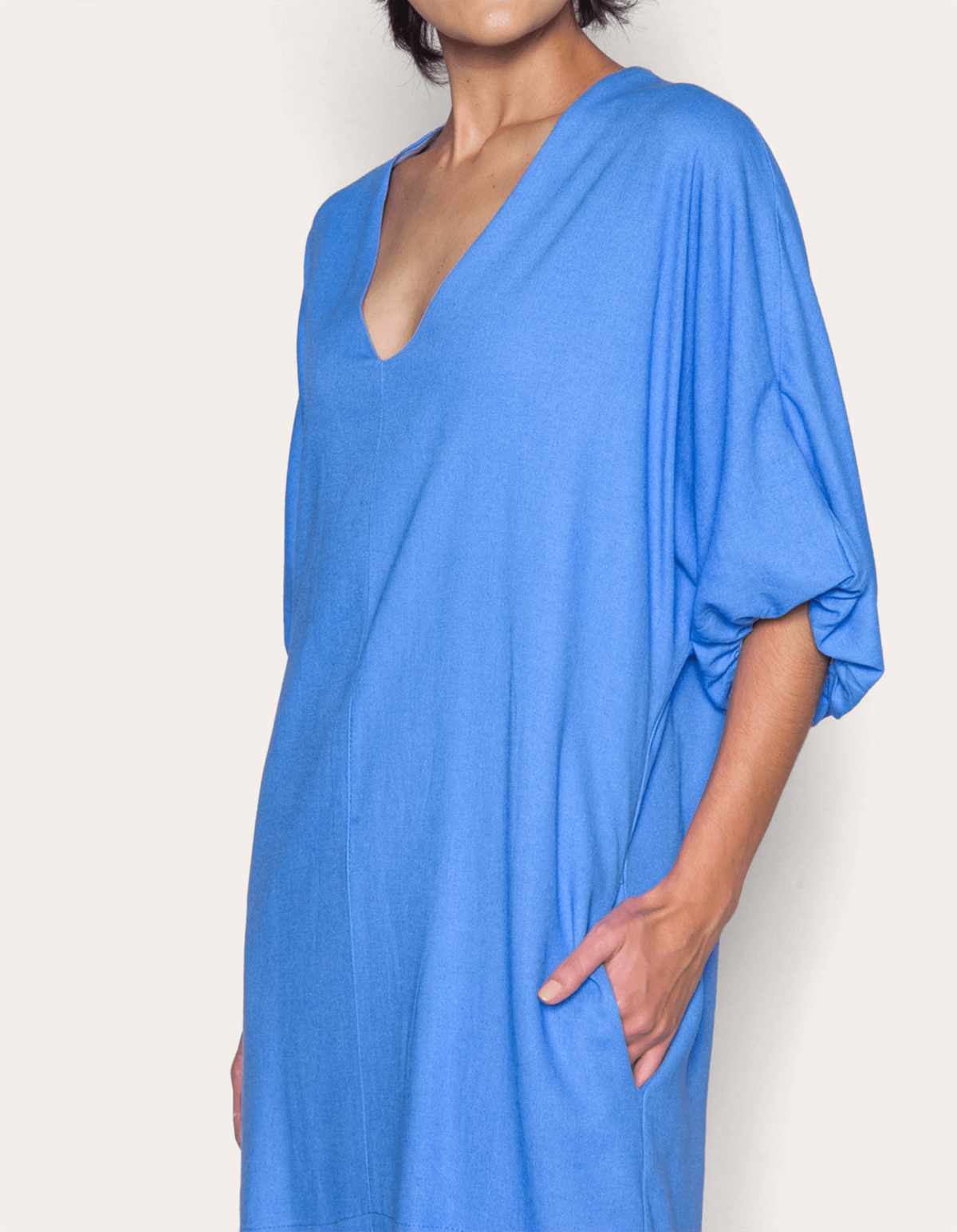 Vestido curto decote v, modelagem reta, manga curta bufante com elástico, possui bolsos faca nas laterais. proporciona uma aparência delicada e contemporânea. uma peça refinada e aconchegante, perfeita para várias ocasiões.