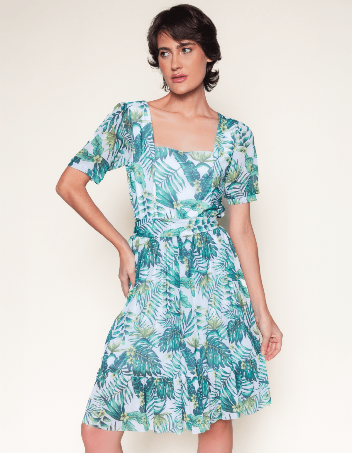 Vestido curto, manga curta, decote quadrado com faixa. acompanha faixa. é um verdadeiro trend-alert! uma peça super estilosa e que é a cara da estação.