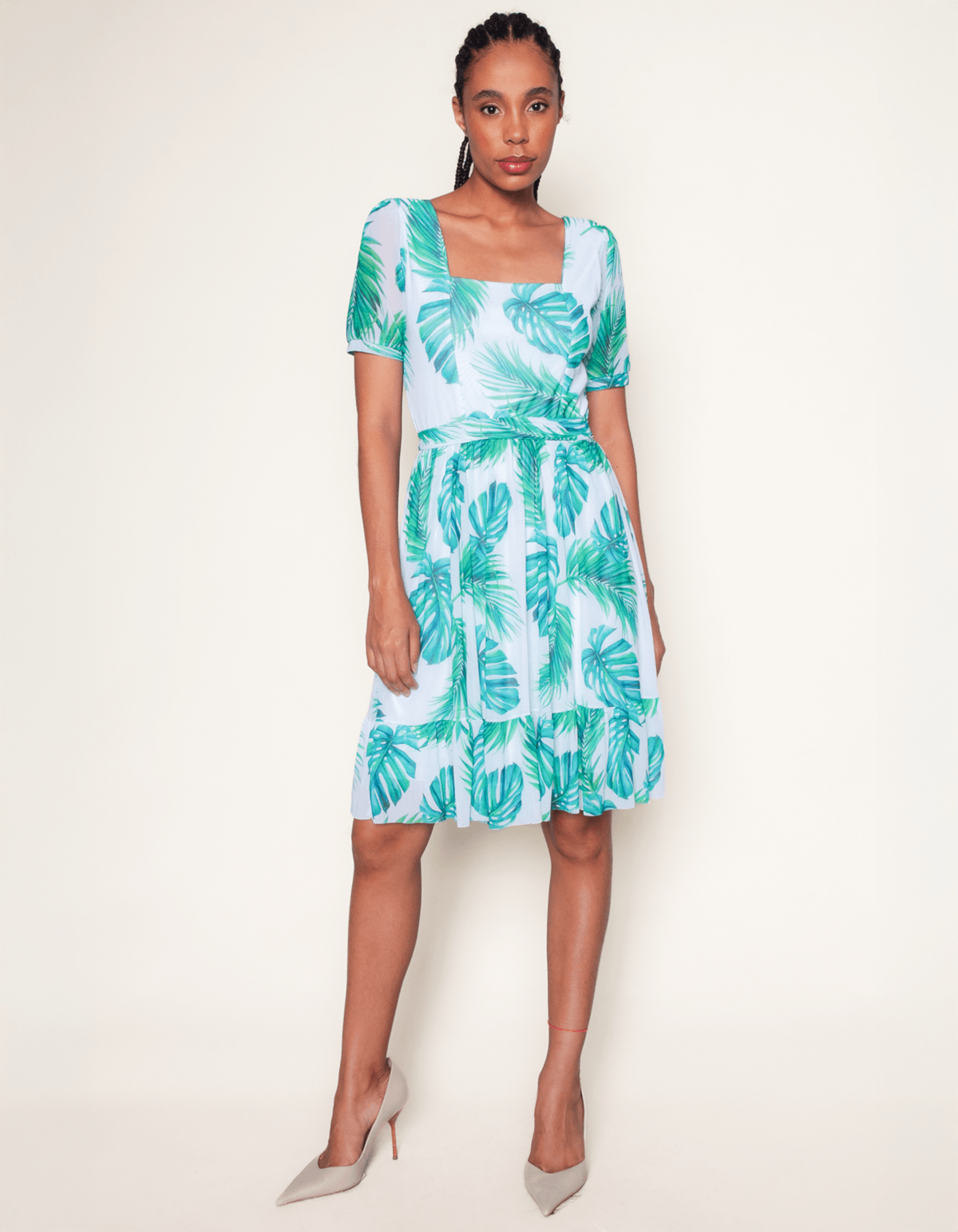 Vestido curto, manga curta, decote quadrado com faixa. acompanha faixa. é um verdadeiro trend-alert! uma peça super estilosa e que é a cara da estação.