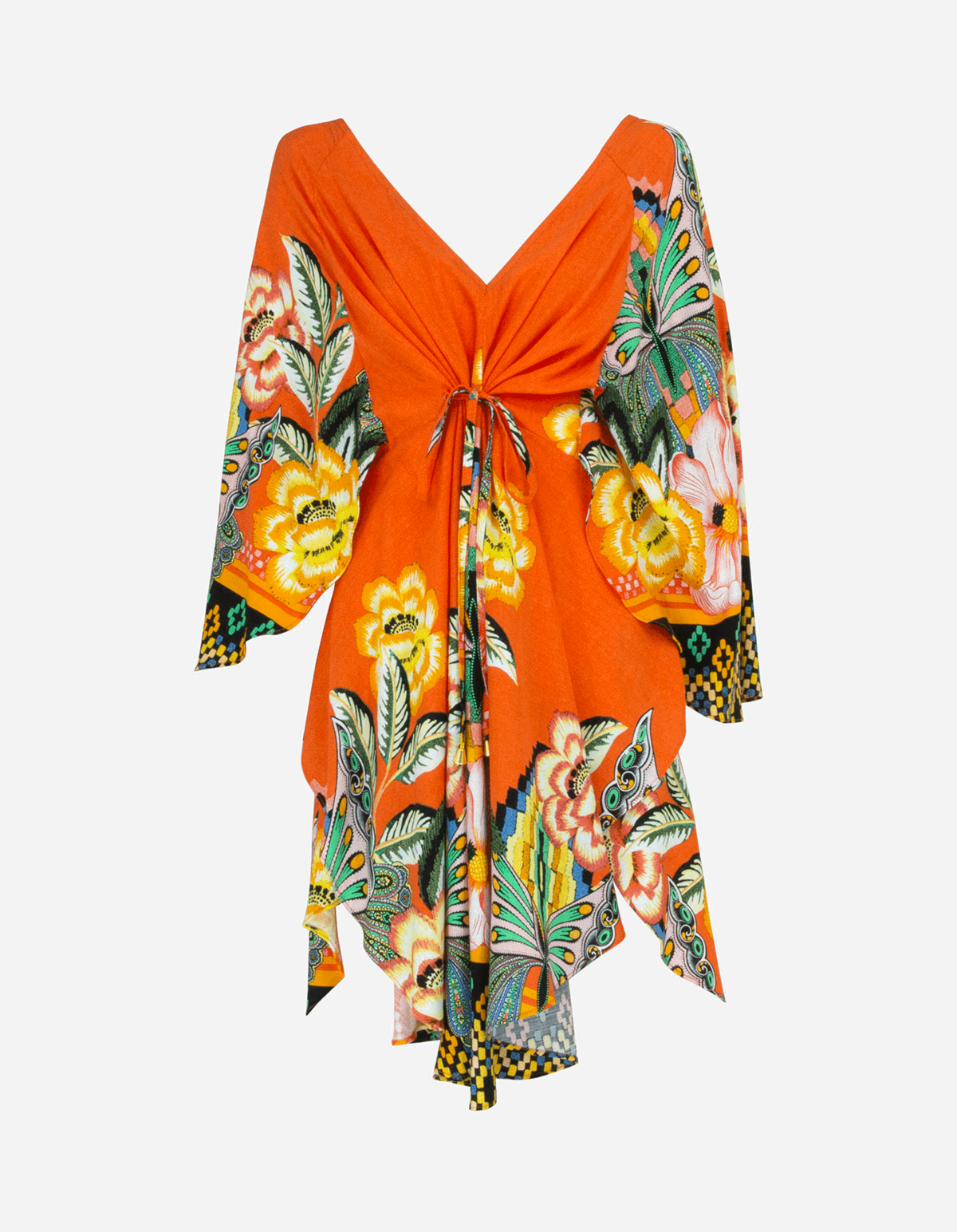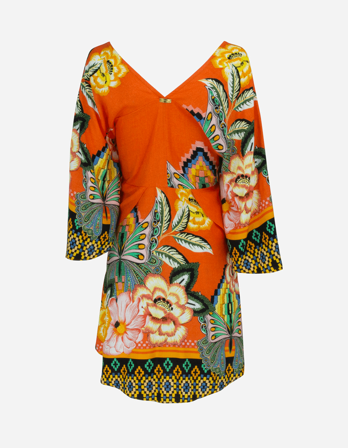 Vestido kaftan manga borboleta Fl/folhas laranja