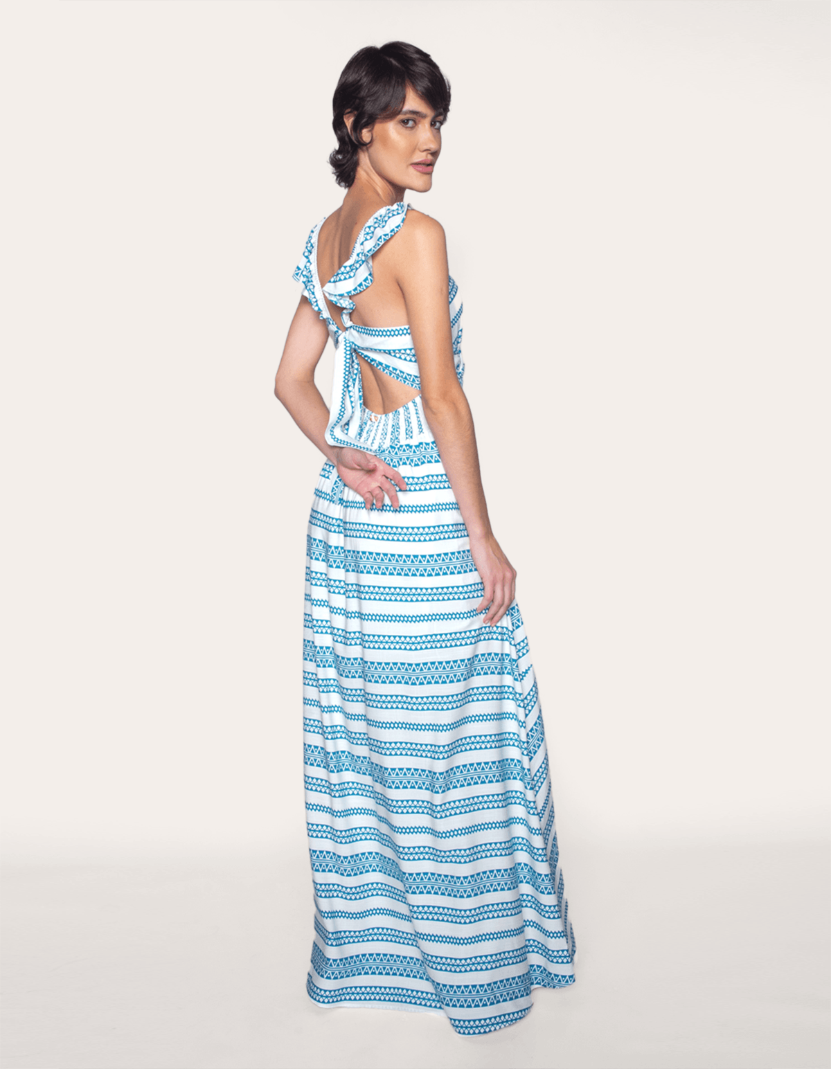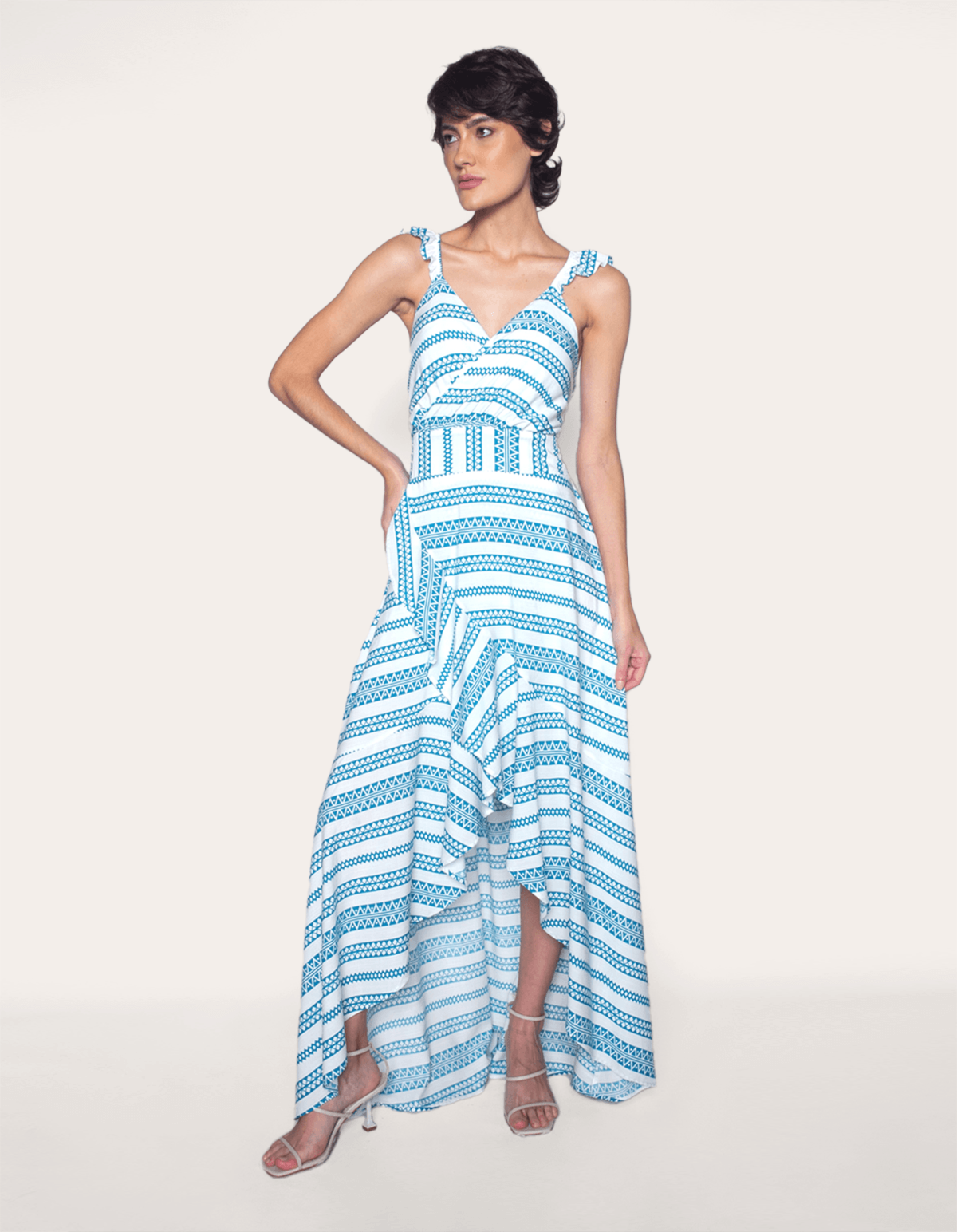 Vestido longo barra babado, com bojo, barra assimétrica. ele é uma ótima opção tanto para ocasiões formais quanto para eventos casuais. o comprimento é um equilíbrio perfeito, proporcionando conforto e estilo em uma única peça.