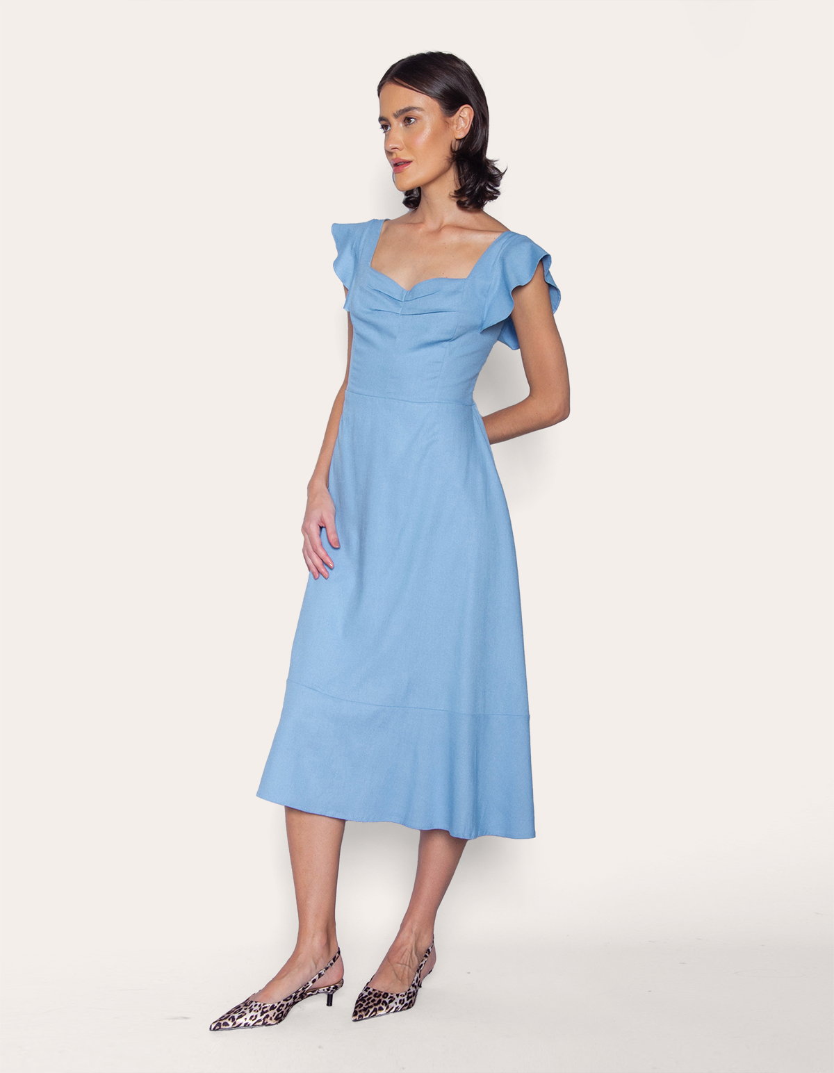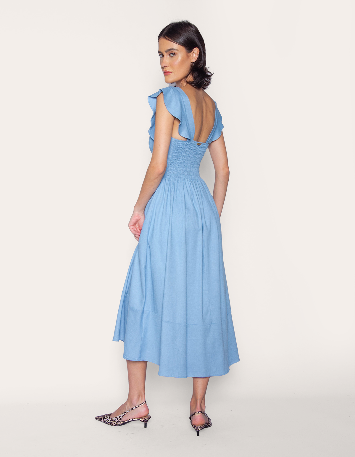Vestido midi de viscolinho. o detalhe de babado nas alças trazem durabilidade e resistência à peça! ideal para eventos sociais, reuniões executivas ou mesmo um jantar romântico, este vestido garante que você se destaque pelo bom gosto e sofisticação.