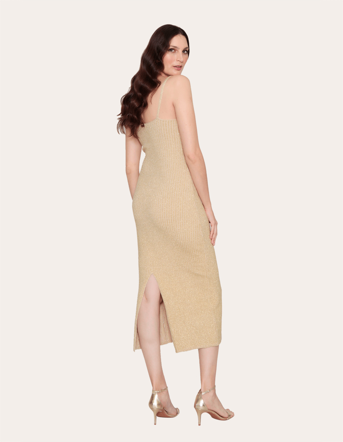 Vestido confeccionado em tricot lurex, modelo longo. alcinha, decote v, fenda atrás, acabamento e costura no tom. use para uma ocasião especial!!
