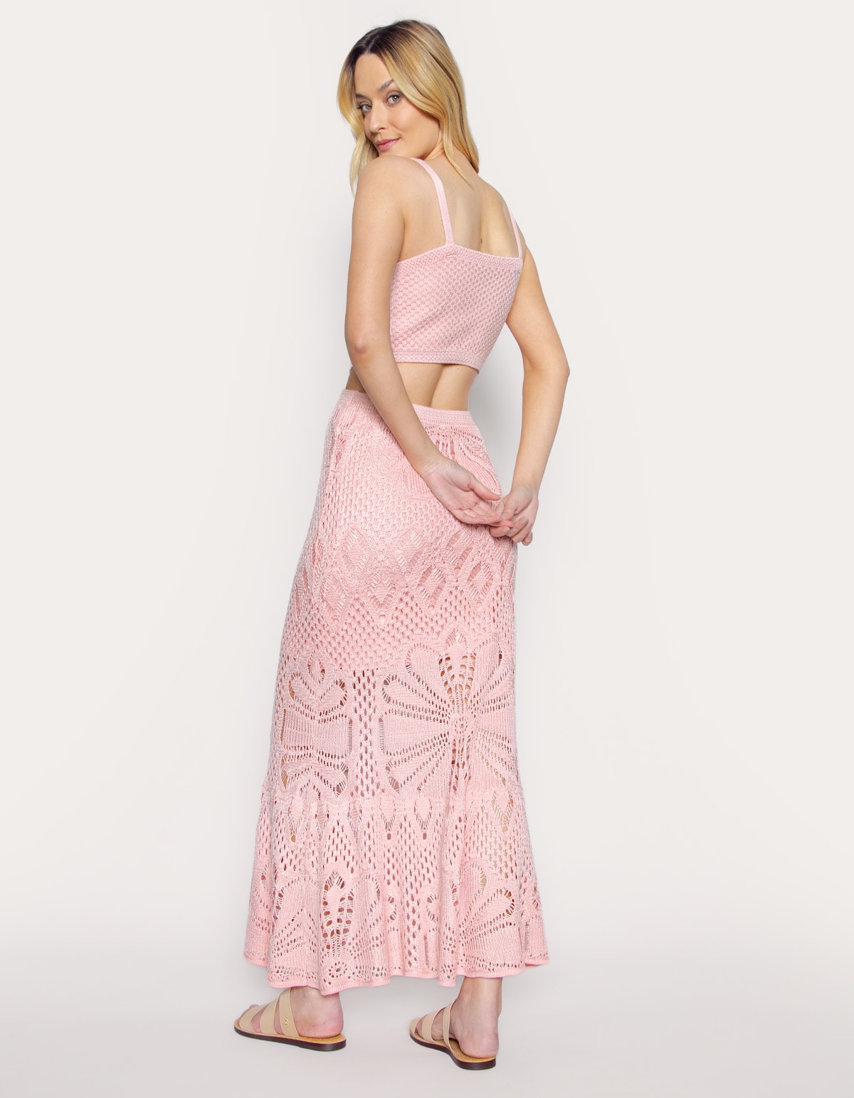 Vestido longo tricot com alças médias, sua trama fechada e uniforme no top cria um padrão quadriculado ou de pequenos losangos, o que oferece mais cobertura. Sua saia levemente evasê com um trabalho em ponto vazado e com um desin rendado muito elaborado, criando uma aparência rica e texturizada. O modelo possui um recorte na cintura que deixa uma pequena faixa de pele exposta (estilo cut-out), conectando o corpped e a saia. As cores claras reforçam a sensação de leveza e é ideal para ocasiões de verão ou praia. Perfeito para eventos diurnos ou noturnos em locais quentes. É um modelo que une a simplicidade da cor com a riqueza dos detalhes.