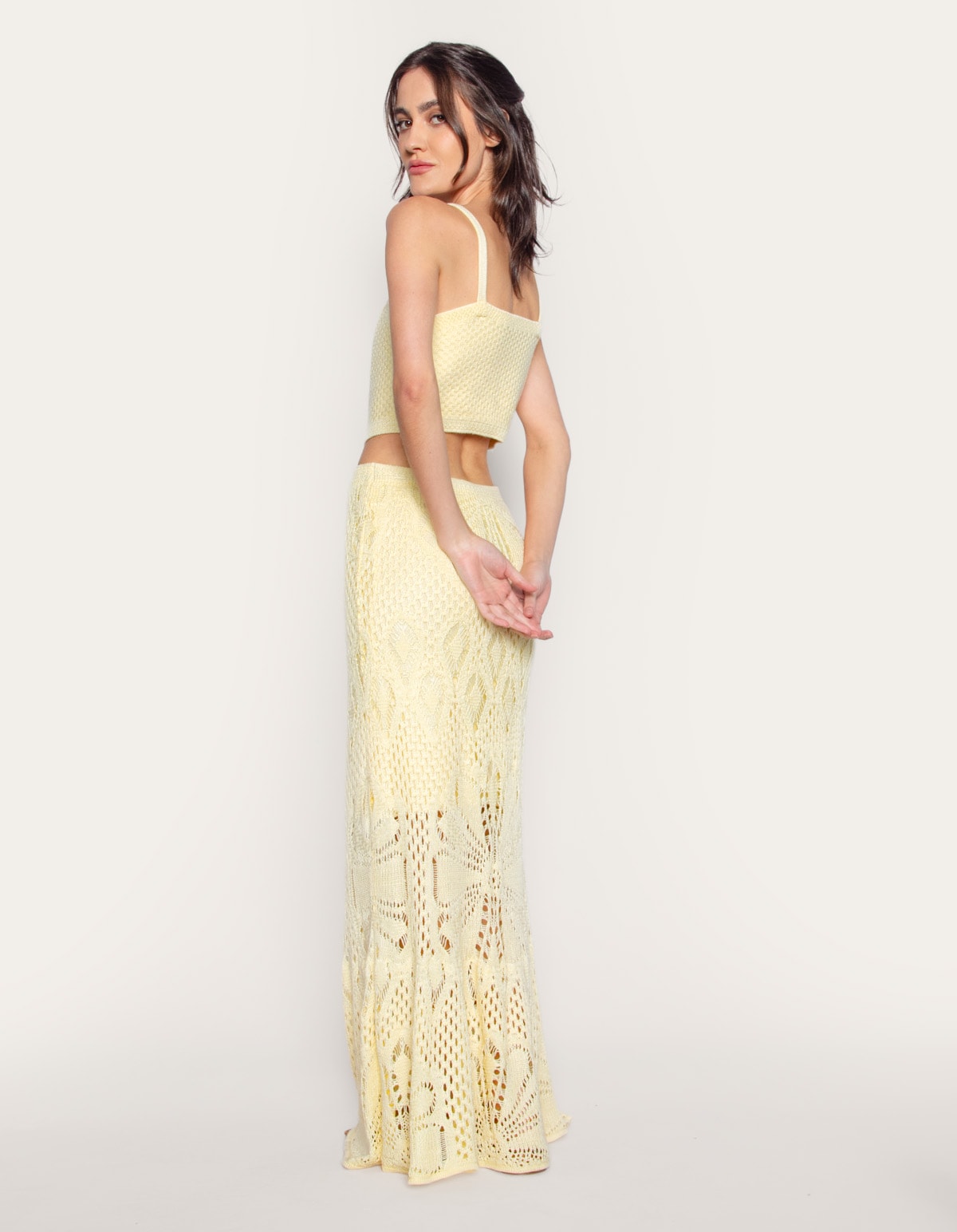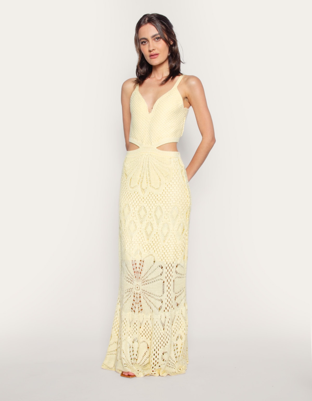 Vestido longo tricot com alças médias, sua trama fechada e uniforme no top cria um padrão quadriculado ou de pequenos losangos, o que oferece mais cobertura. Sua saia levemente evasê com um trabalho em ponto vazado e com um desin rendado muito elaborado, criando uma aparência rica e texturizada. O modelo possui um recorte na cintura que deixa uma pequena faixa de pele exposta (estilo cut-out), conectando o corpped e a saia. As cores claras reforçam a sensação de leveza e é ideal para ocasiões de verão ou praia. Perfeito para eventos diurnos ou noturnos em locais quentes. É um modelo que une a simplicidade da cor com a riqueza dos detalhes.