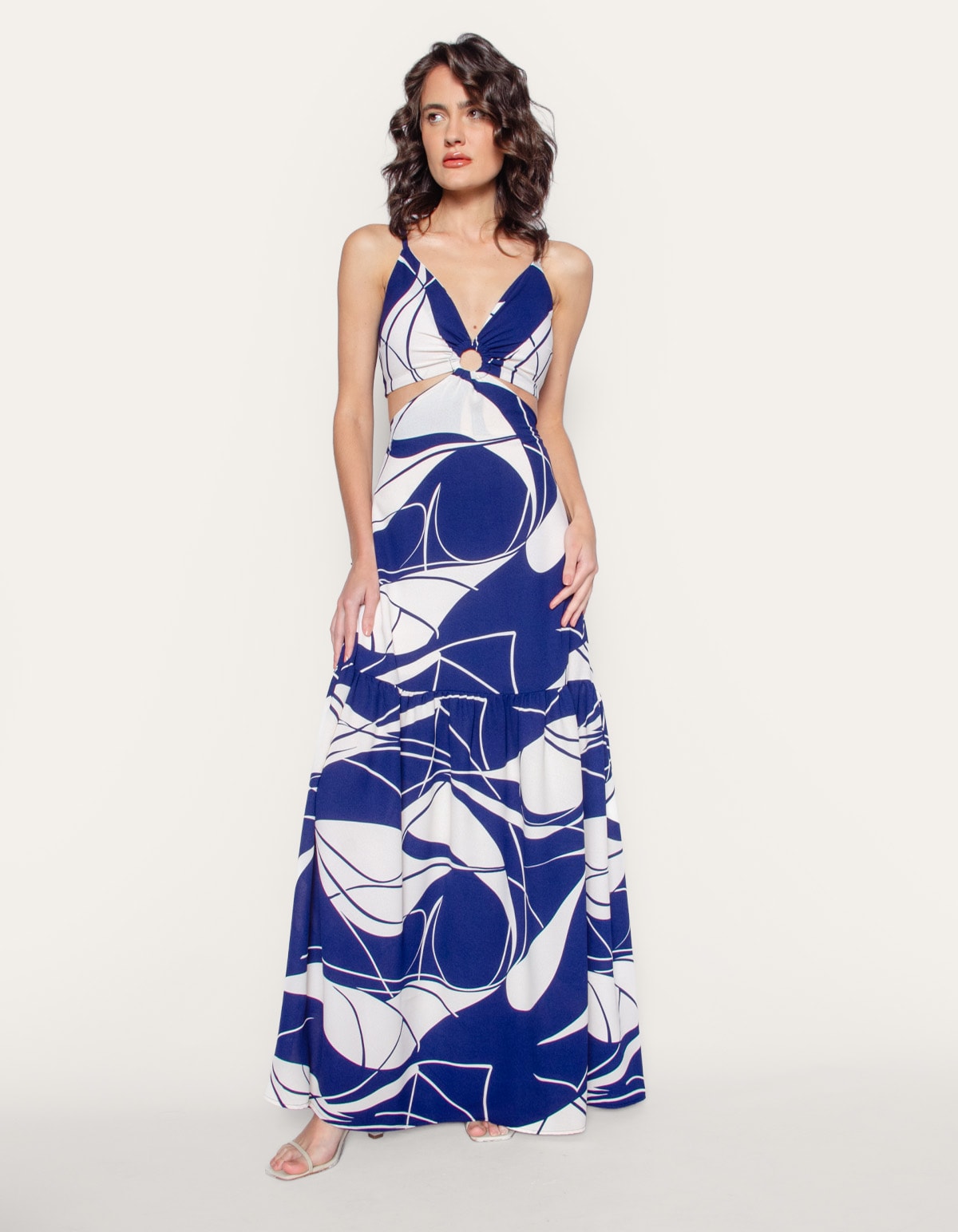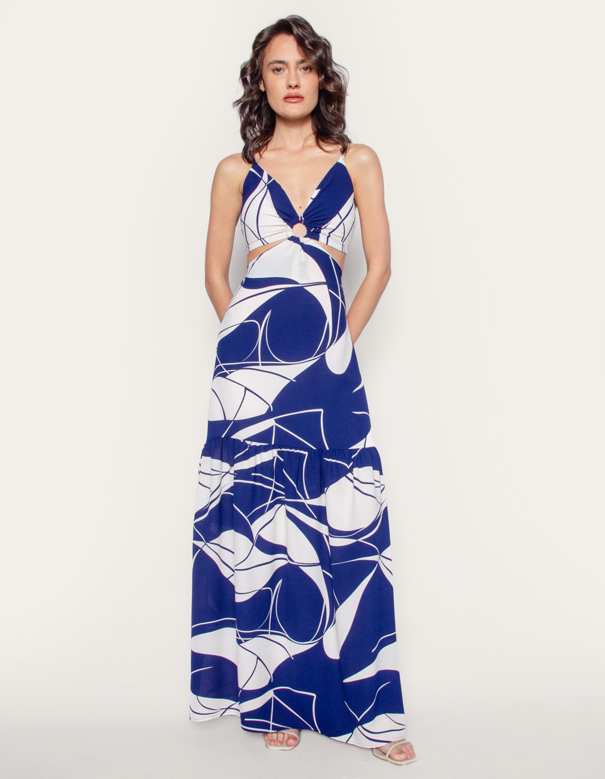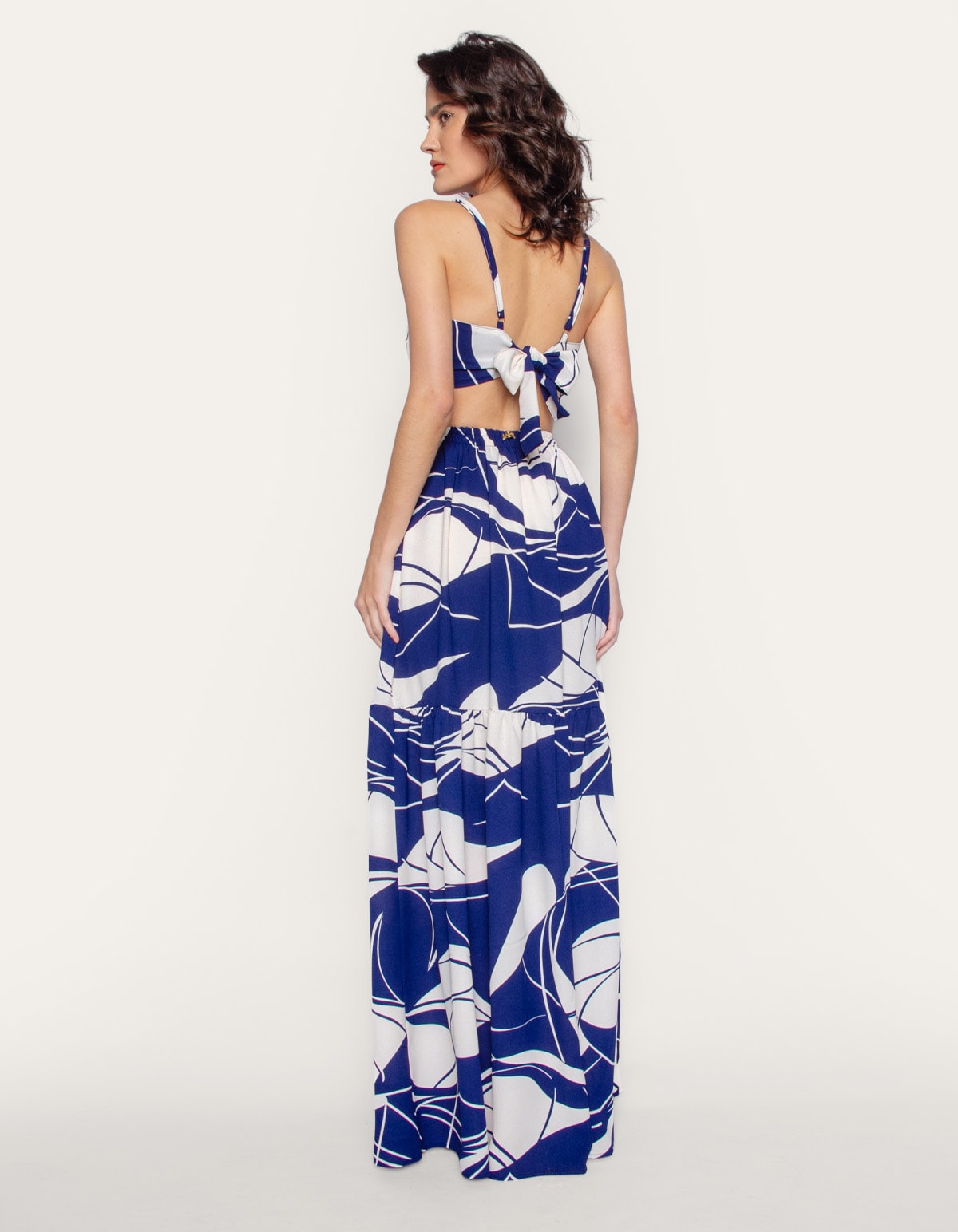 Vestido longo estampado de alcinha, com bojo e detalhe argola no decote. possui amarração nas costas e cintura costas com elástico. uma peça elegante e atemporal.