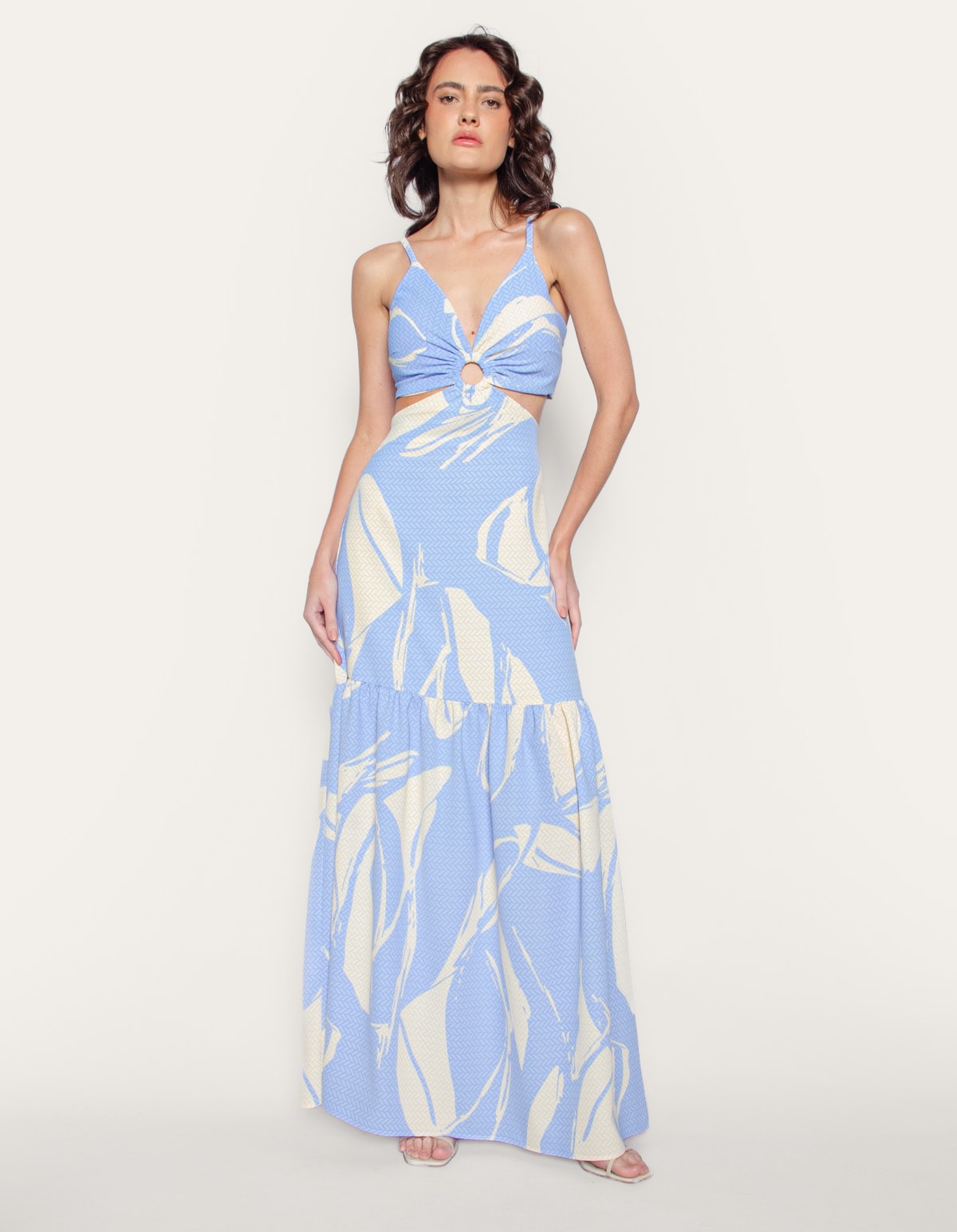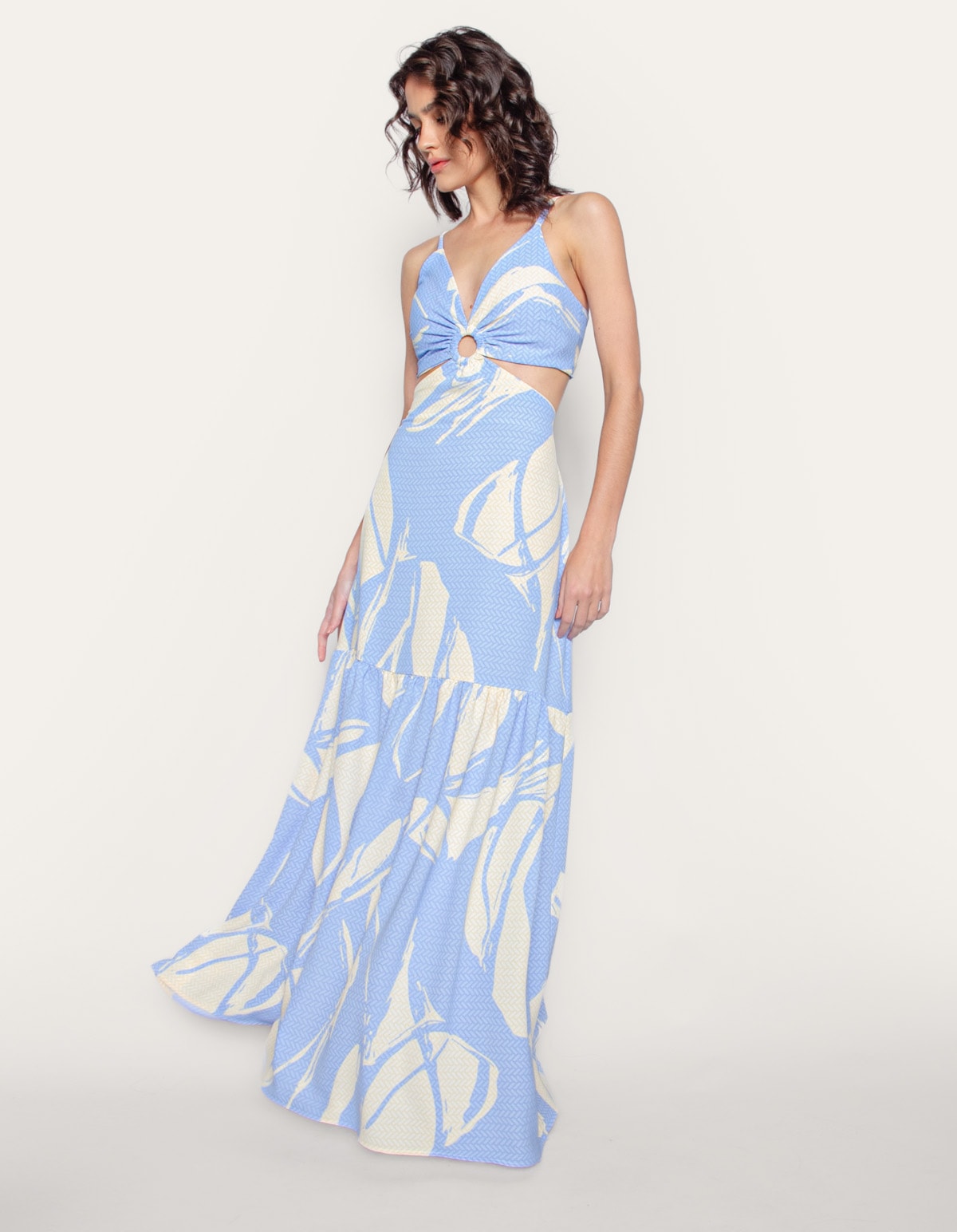 Vestido longo estampado de alcinha, com bojo e detalhe argola no decote. possui amarração nas costas e cintura costas com elástico. uma peça elegante e atemporal.