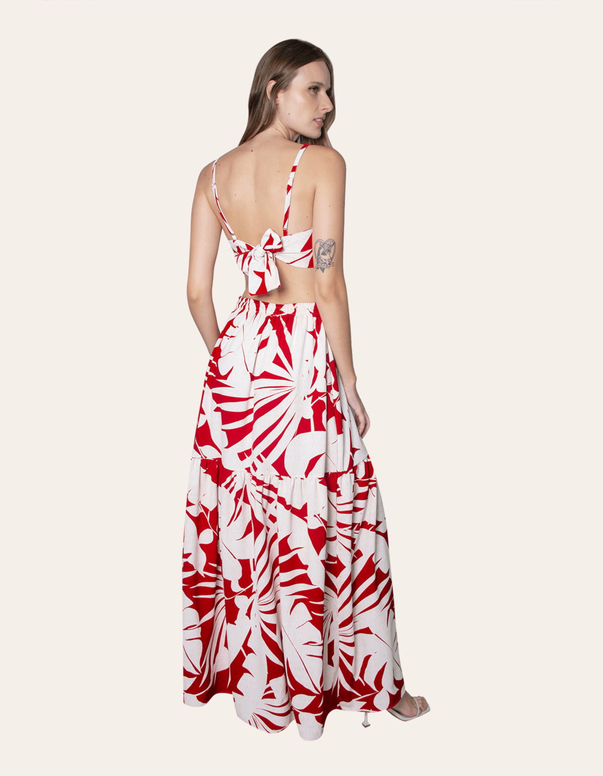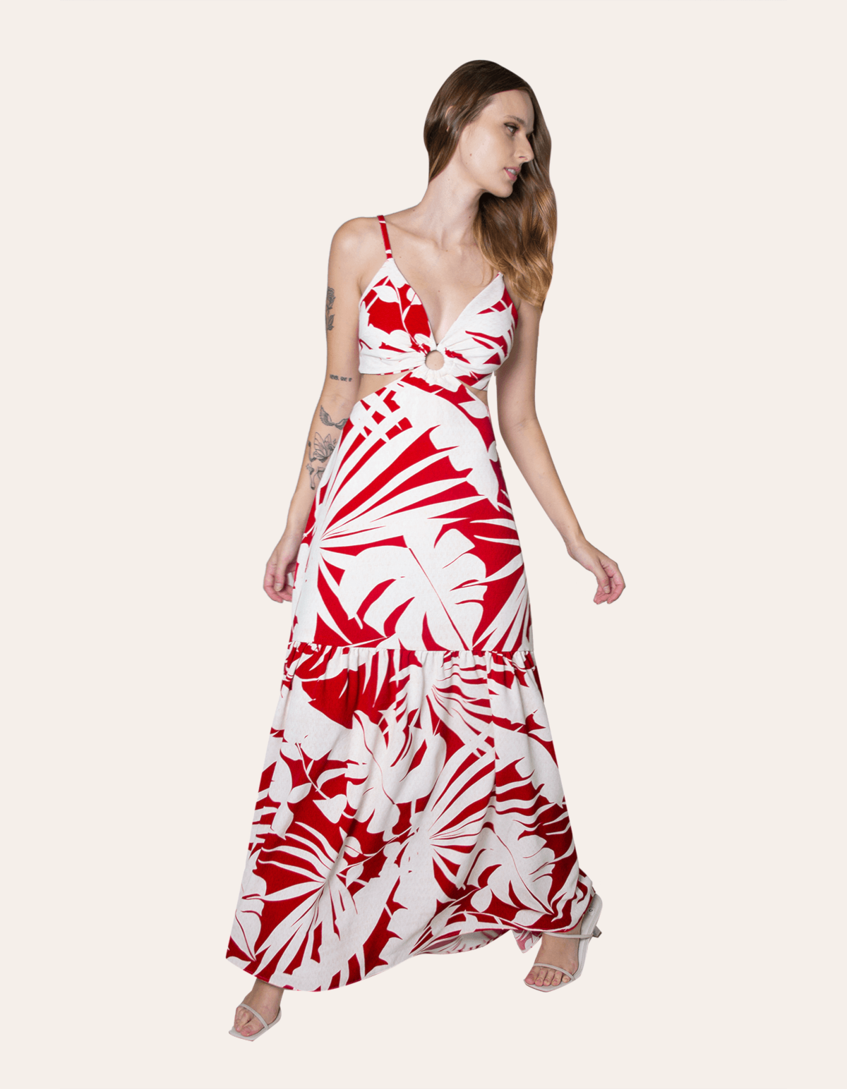 Vestido longo estampado de alcinha, com bojo e detalhe argola no decote. possui amarração nas costas e cintura costas com elástico. uma peça elegante e atemporal.