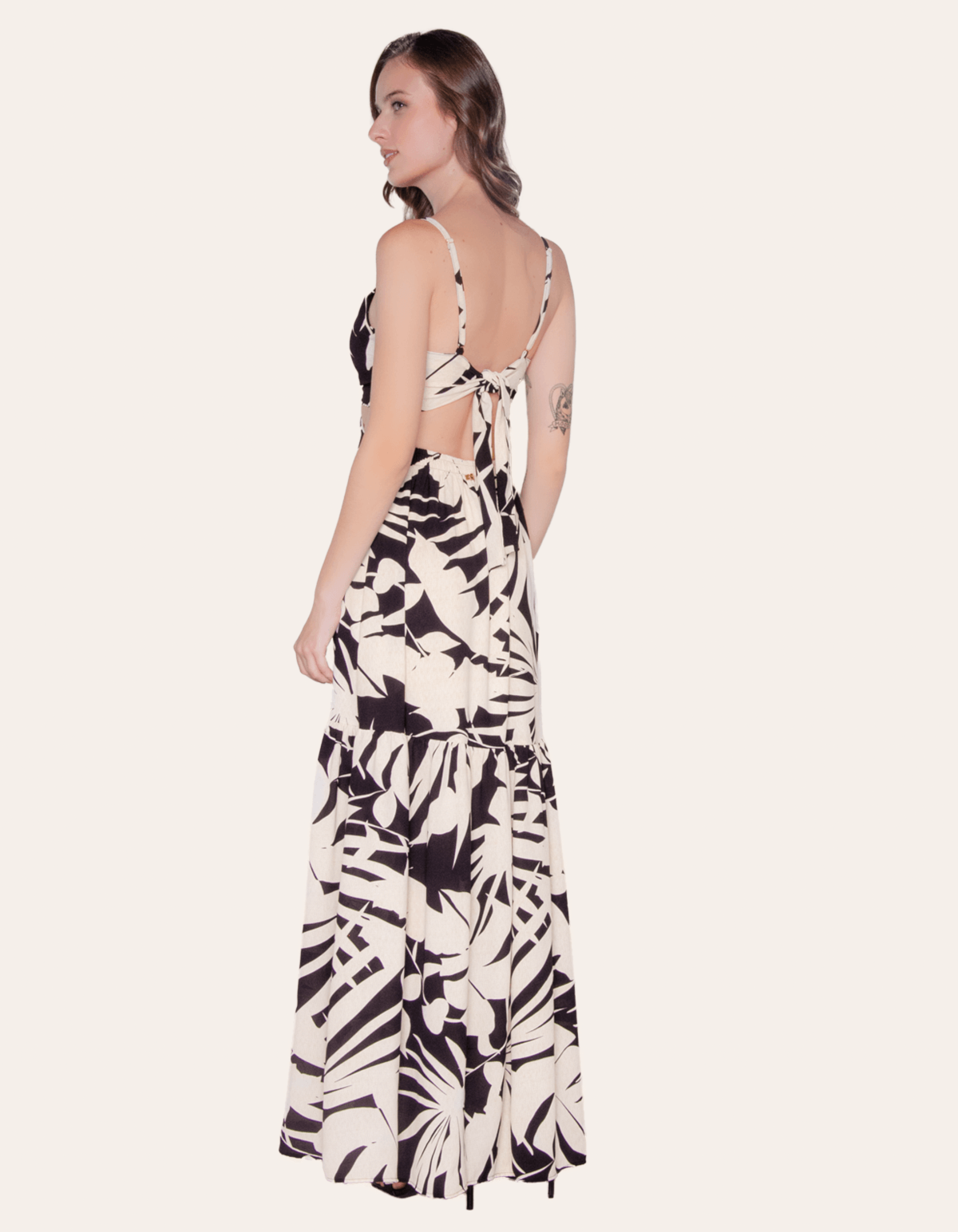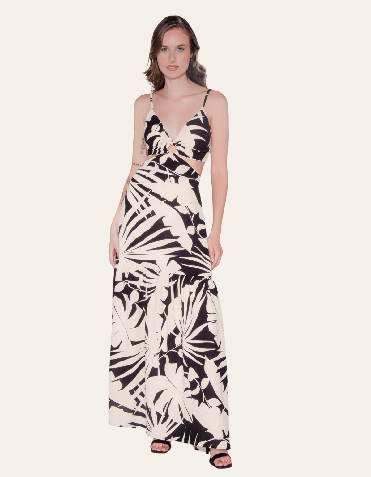 Vestido longo estampado de alcinha, com bojo e detalhe argola no decote. possui amarração nas costas e cintura costas com elástico. uma peça elegante e atemporal.