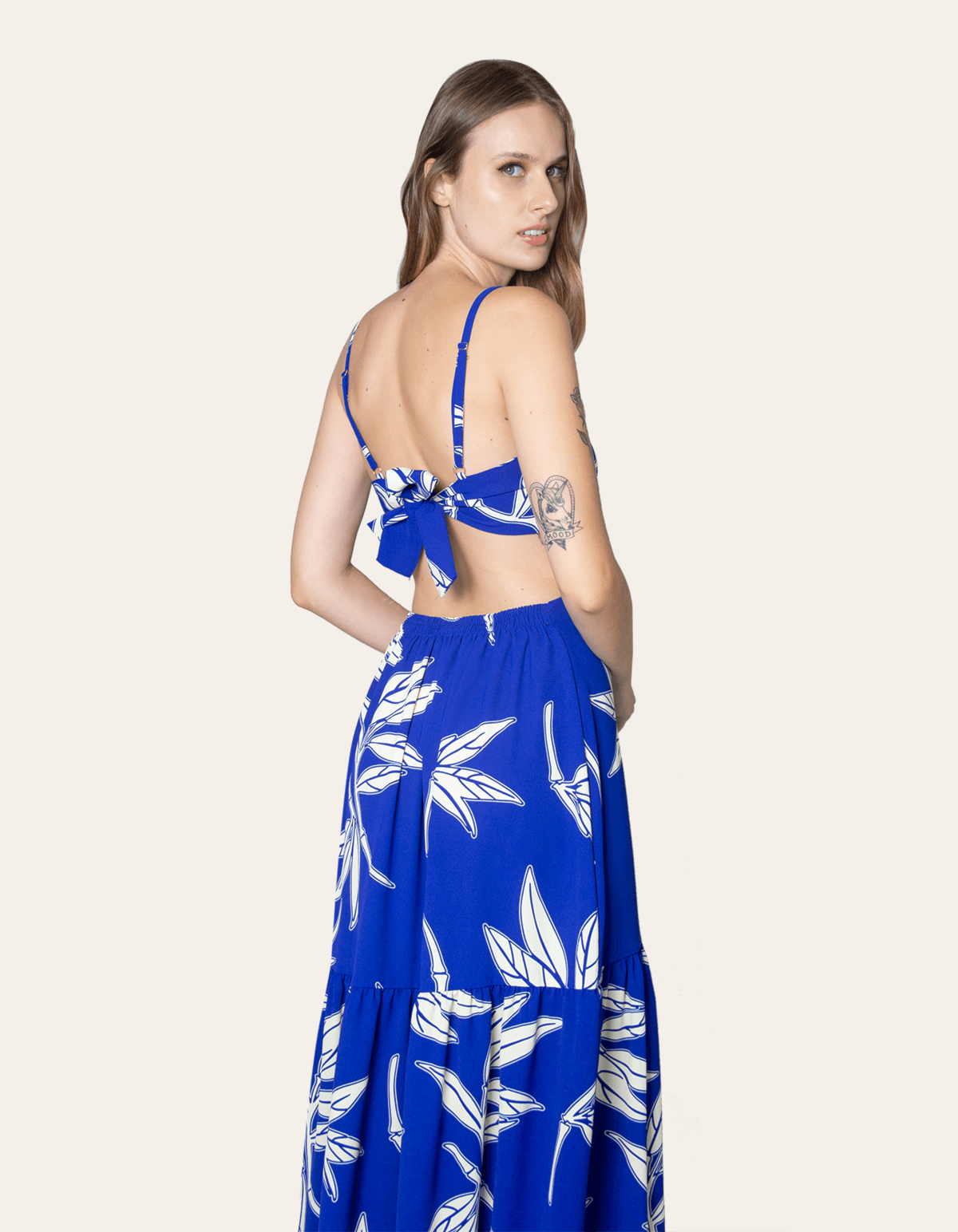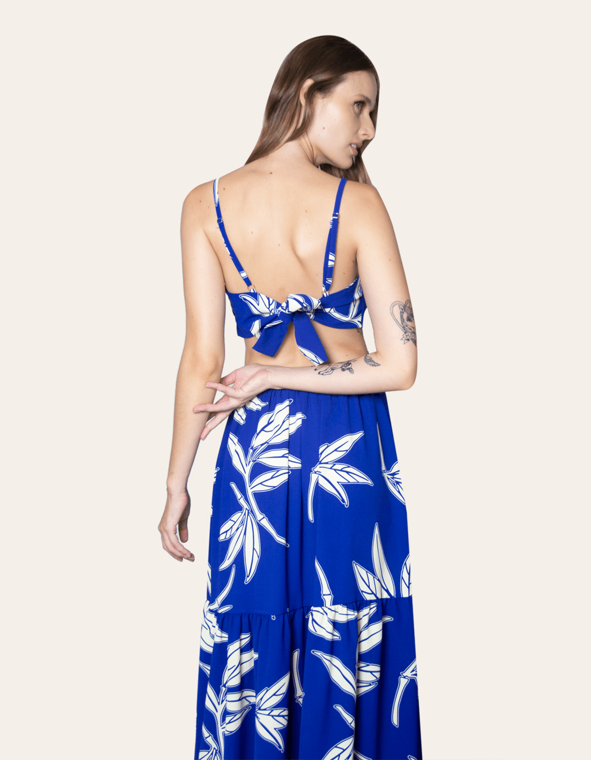 Vestido longo estampado de alcinha, com bojo e detalhe argola no decote. possui amarração nas costas e cintura costas com elástico. uma peça elegante e atemporal.