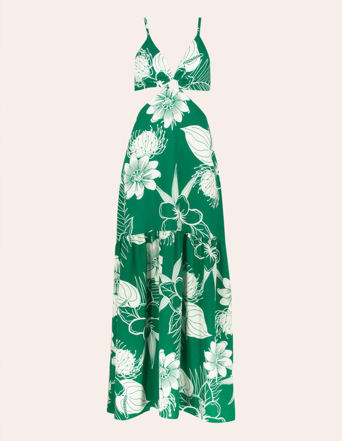 Vestido longo estampado de alcinha, com bojo e detalhe argola no decote. possui amarração nas costas e cintura costas com elástico. uma peça elegante e atemporal.