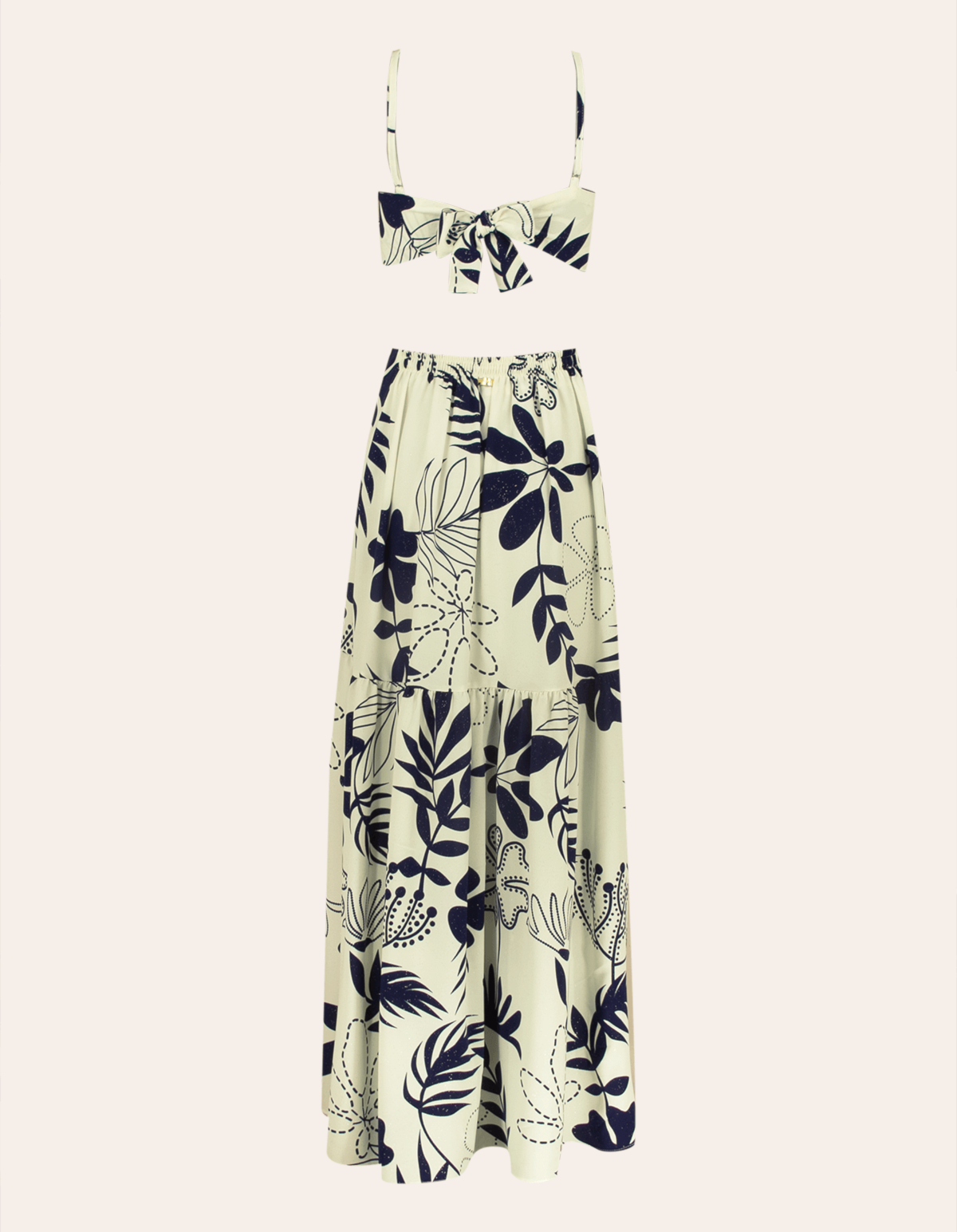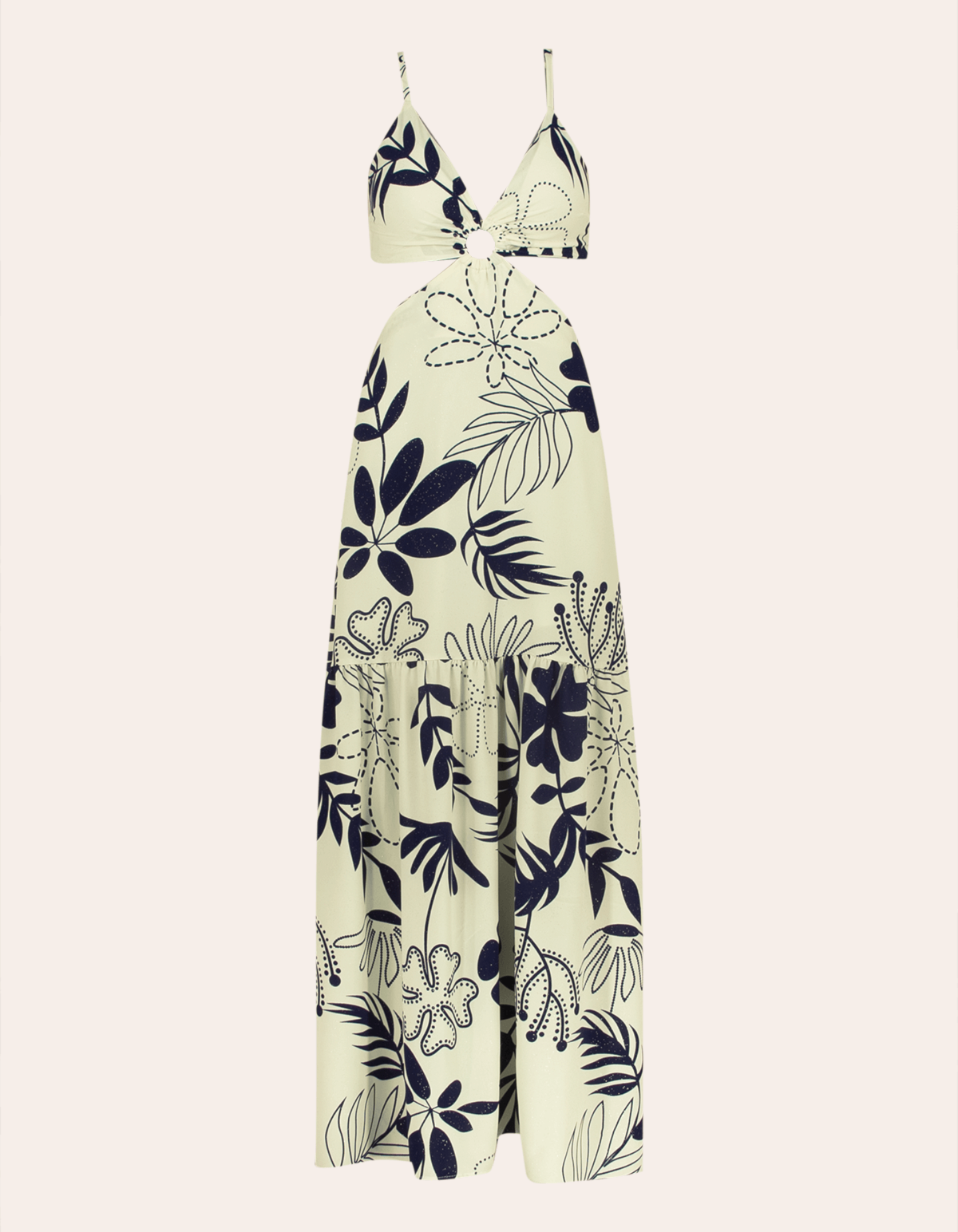 Vestido longo estampado de alcinha, com bojo e detalhe argola no decote. possui amarração nas costas e cintura costas com elástico. uma peça elegante e atemporal.