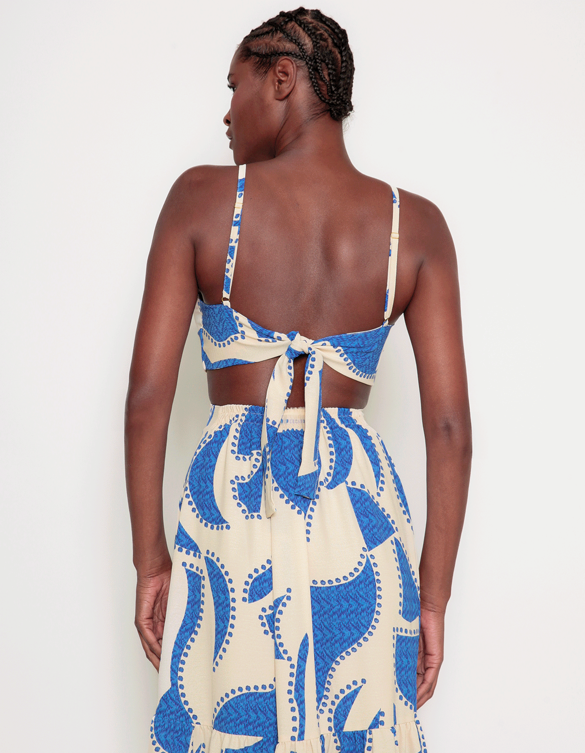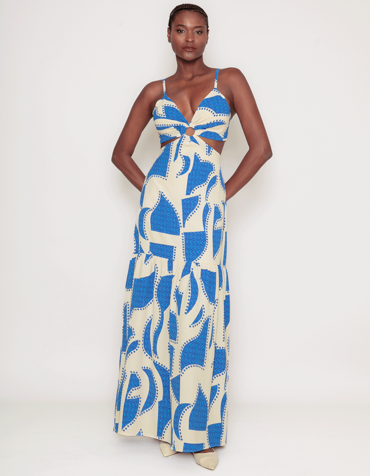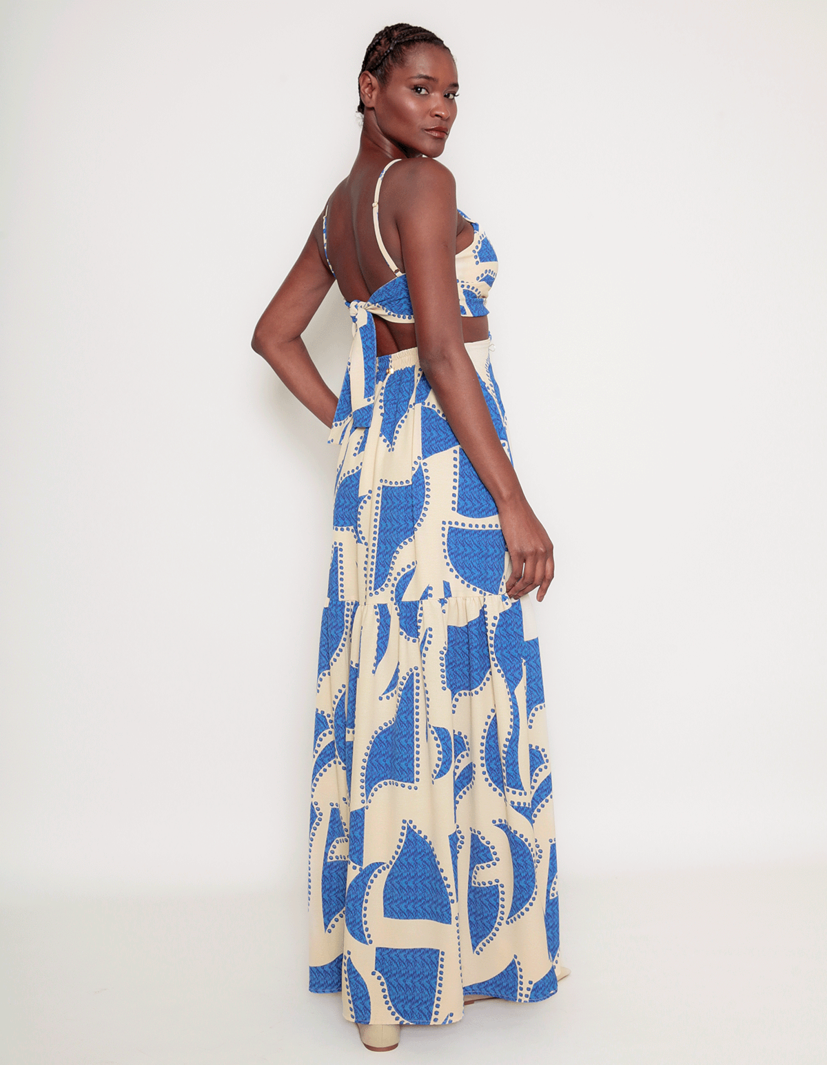 Vestido longo estampado de alcinha, com bojo e detalhe argola no decote. possui amarração nas costas e cintura costas com elástico. uma peça elegante e atemporal.