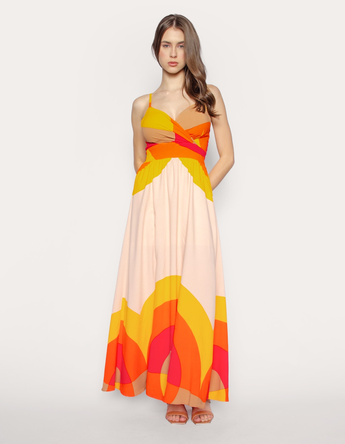 Vestido longo alcinha, decote transpassado e costas em lastex. com um design cuidadosamente elaborado, esse vestido se destaca não apenas pelo visual encantador, mas também pelo caimento impecável que valoriza a silhueta feminina.