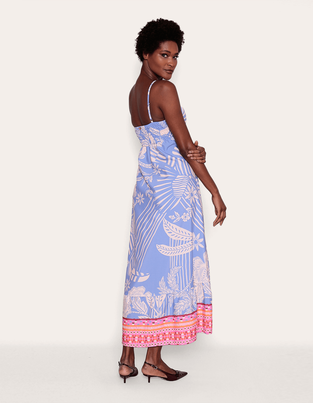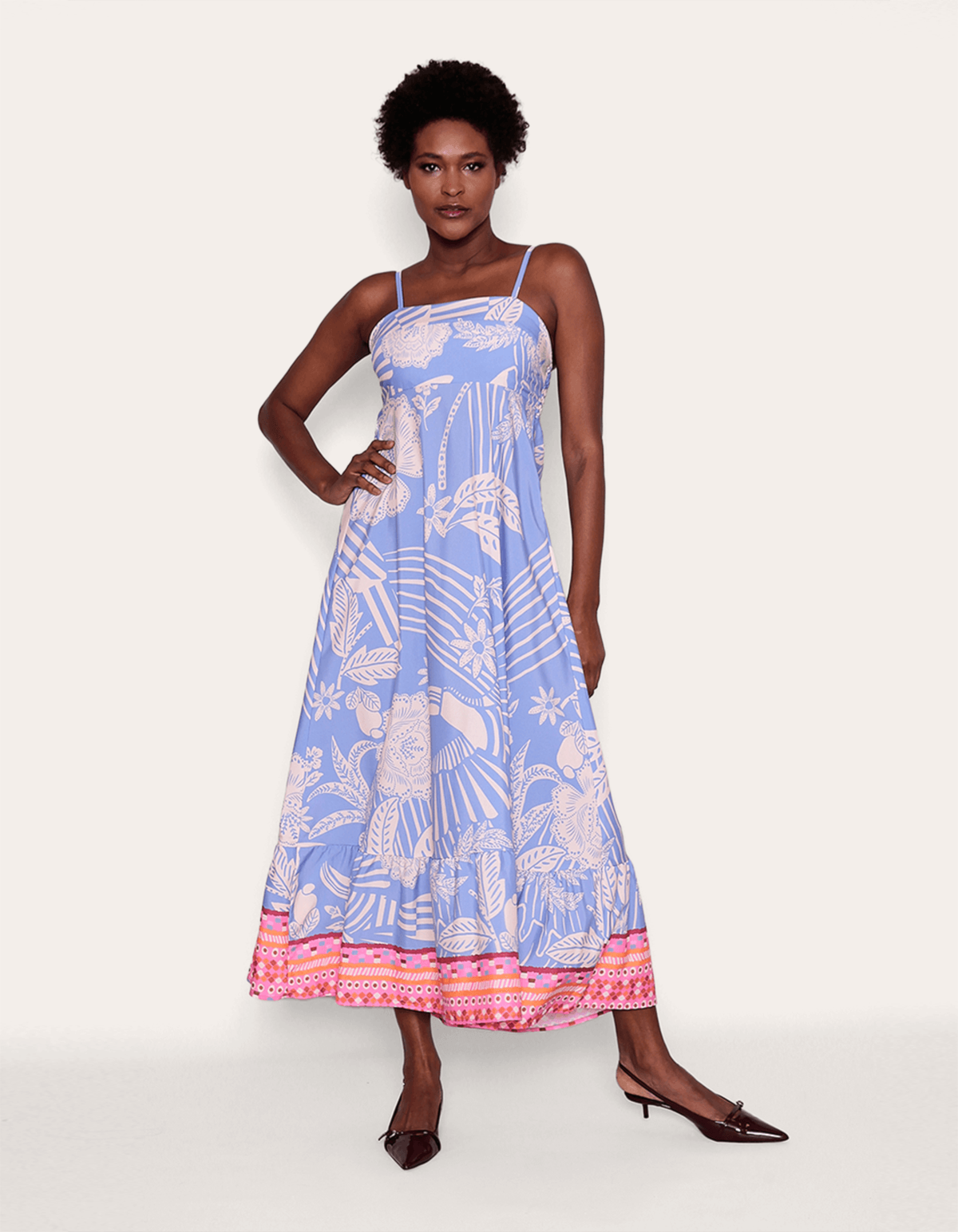 Vestido longo alcinha fina com regulador, decote reto e lastex nas costas. a essência do conforto com uma peça que une praticidade e estilo. sua modelagem versátil torna-o perfeito para diversas ocasiões, proporcionando uma experiência única para quem busca simplicidade com um toque de originalidade.