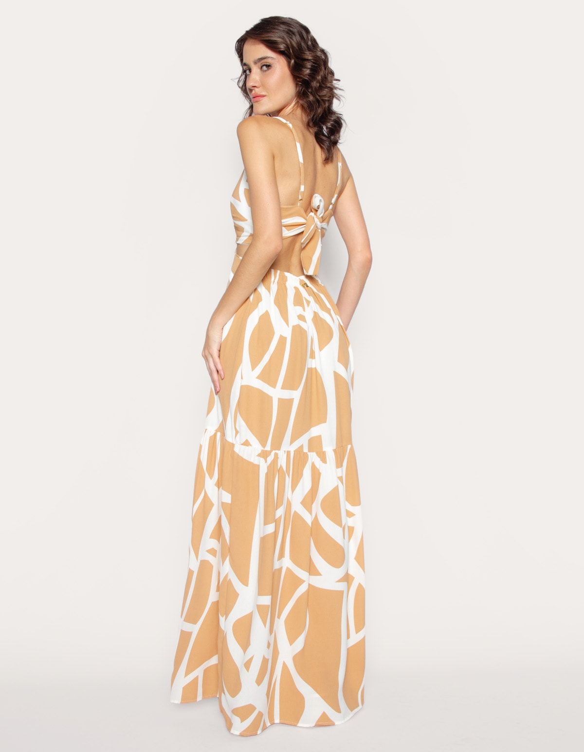 Vestido longo estampado de alcinha, com bojo e detalhe argola no decote. possui amarração nas costas e cintura costas com elástico. uma peça elegante e atemporal.
