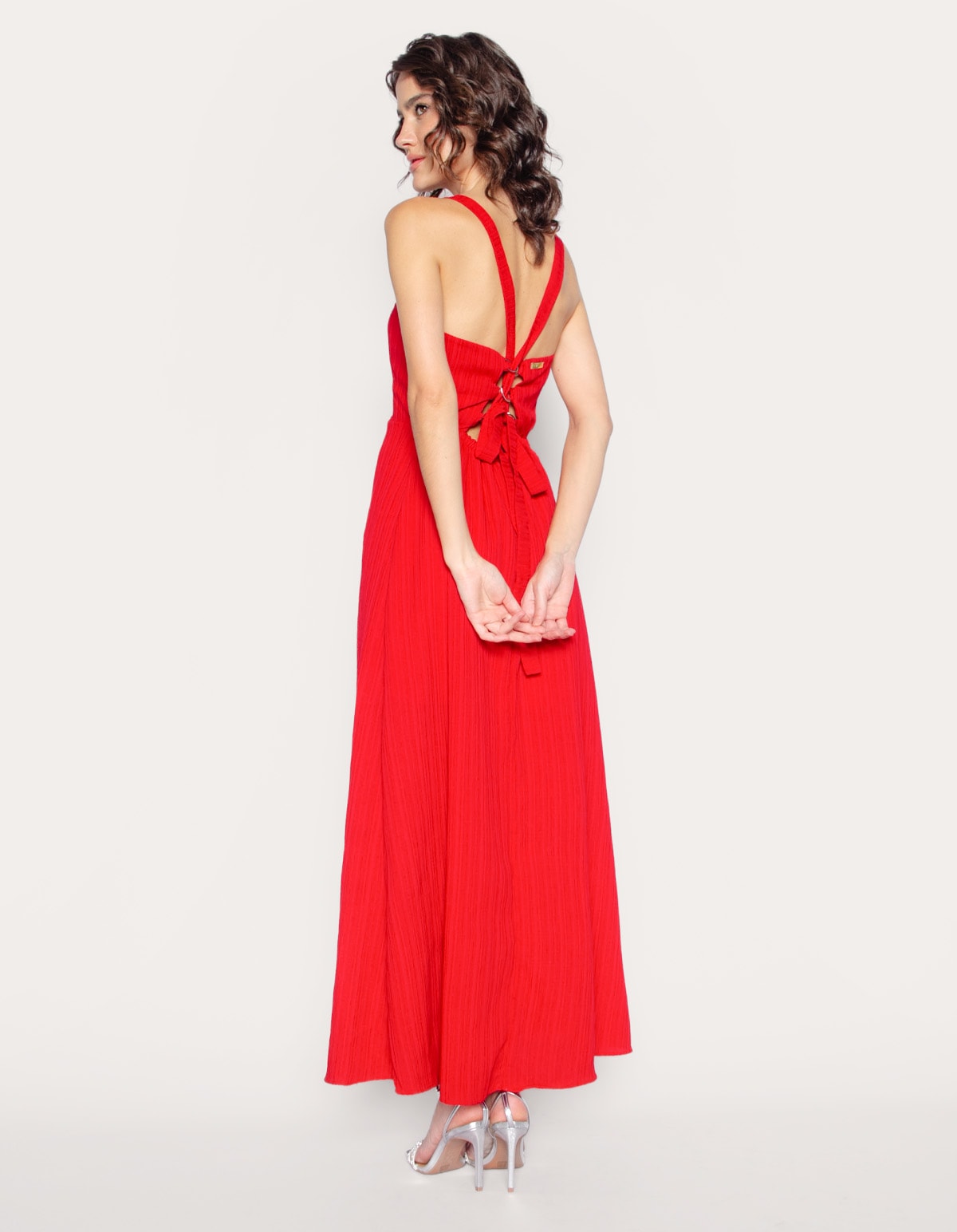 Vestido longo decote quadrado com bojo e alças médias que cruzam nas costas, passando por argolas para amarração, possui elástico na cintura atrás. este vestido é perfeito para aquelas ocasiões especiais em que você deseja se destacar com elegância e estilo.