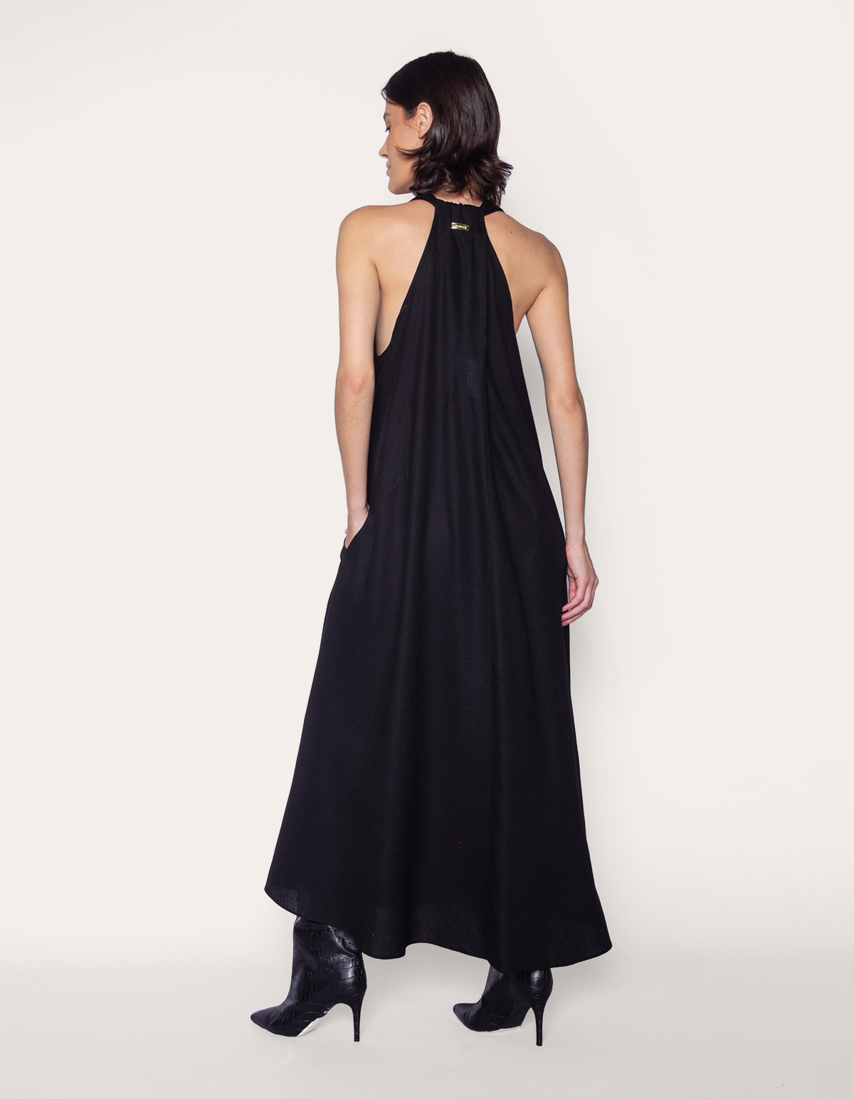 Vestido longo com modelagem ampla, decote V profundo, cava generosa e dois bolsos laterais funcionais.