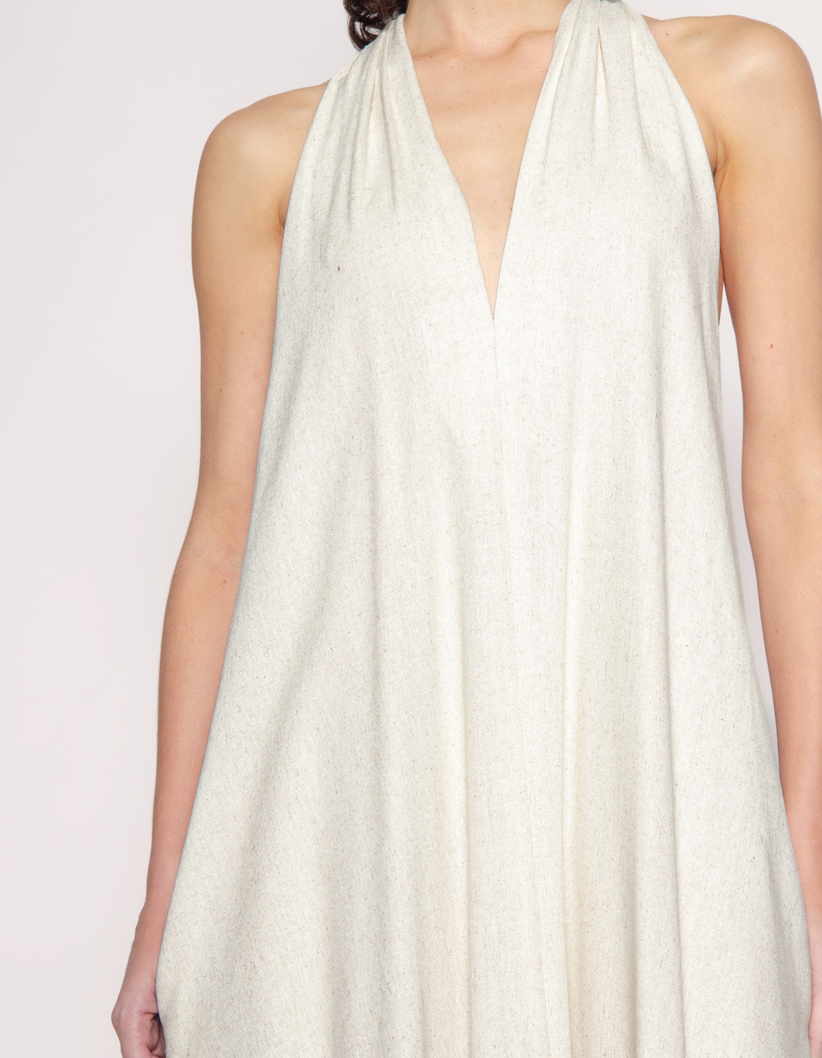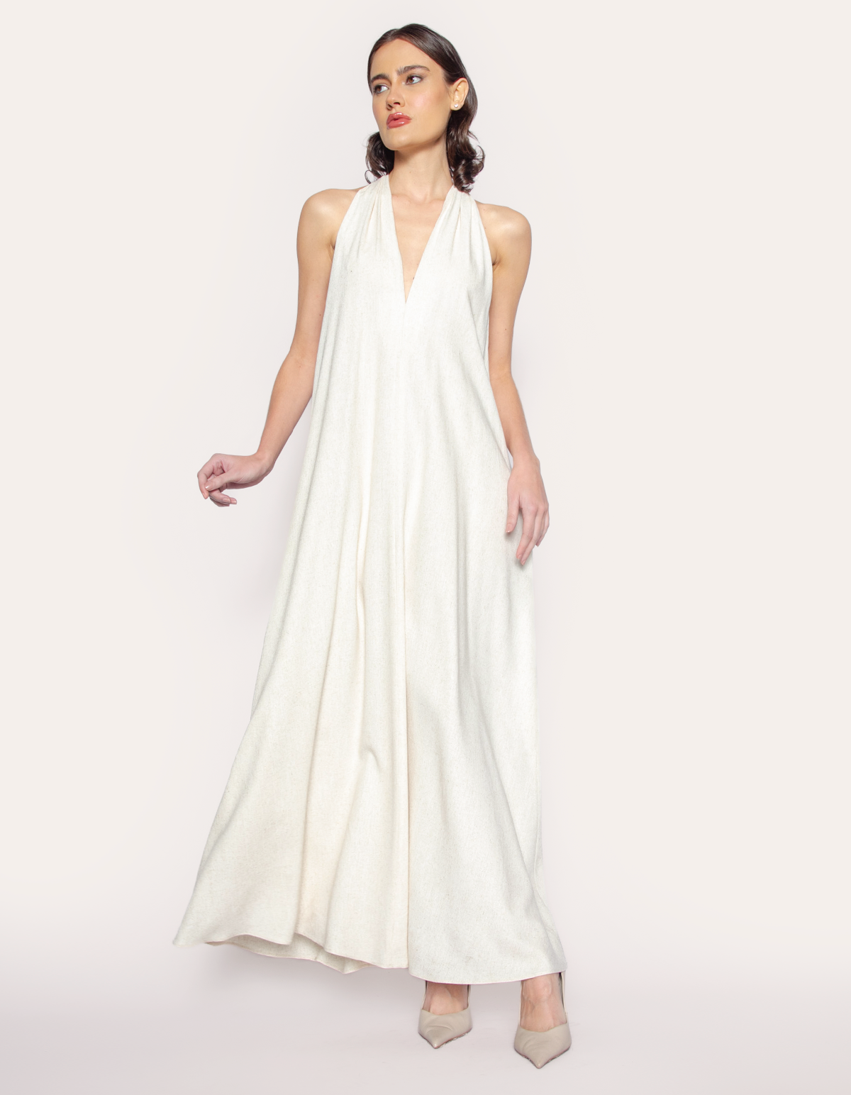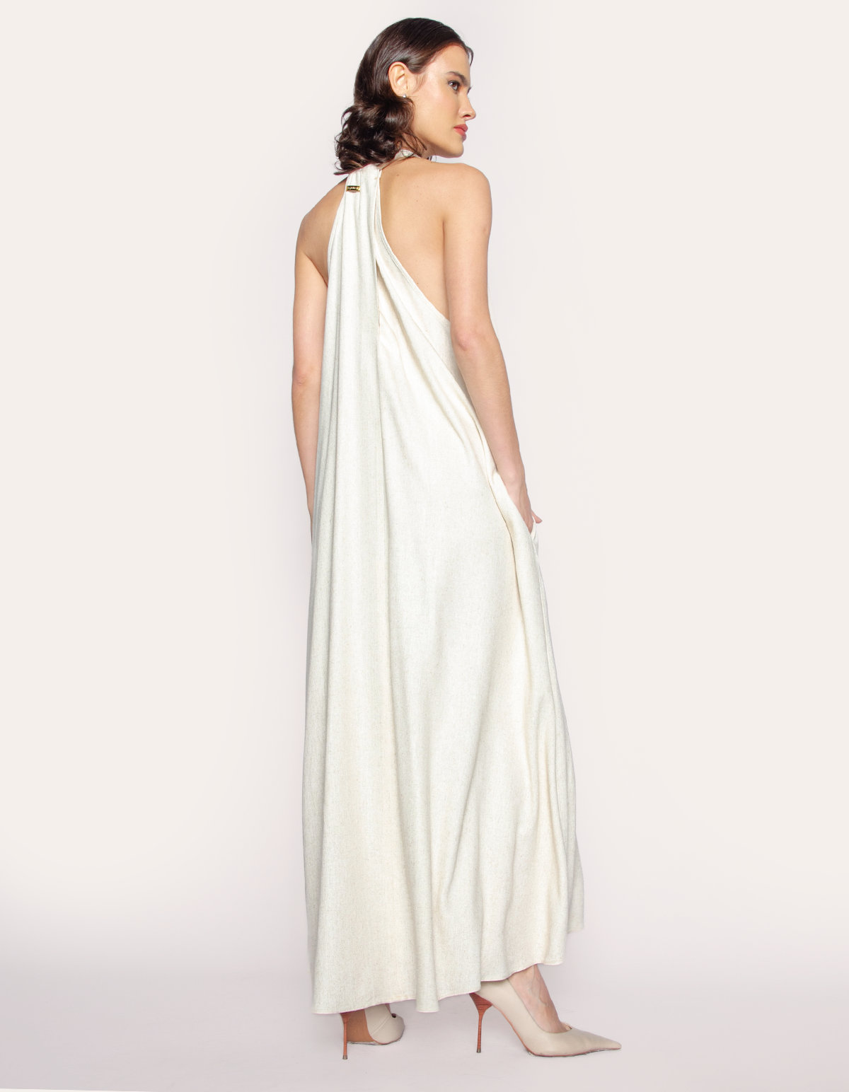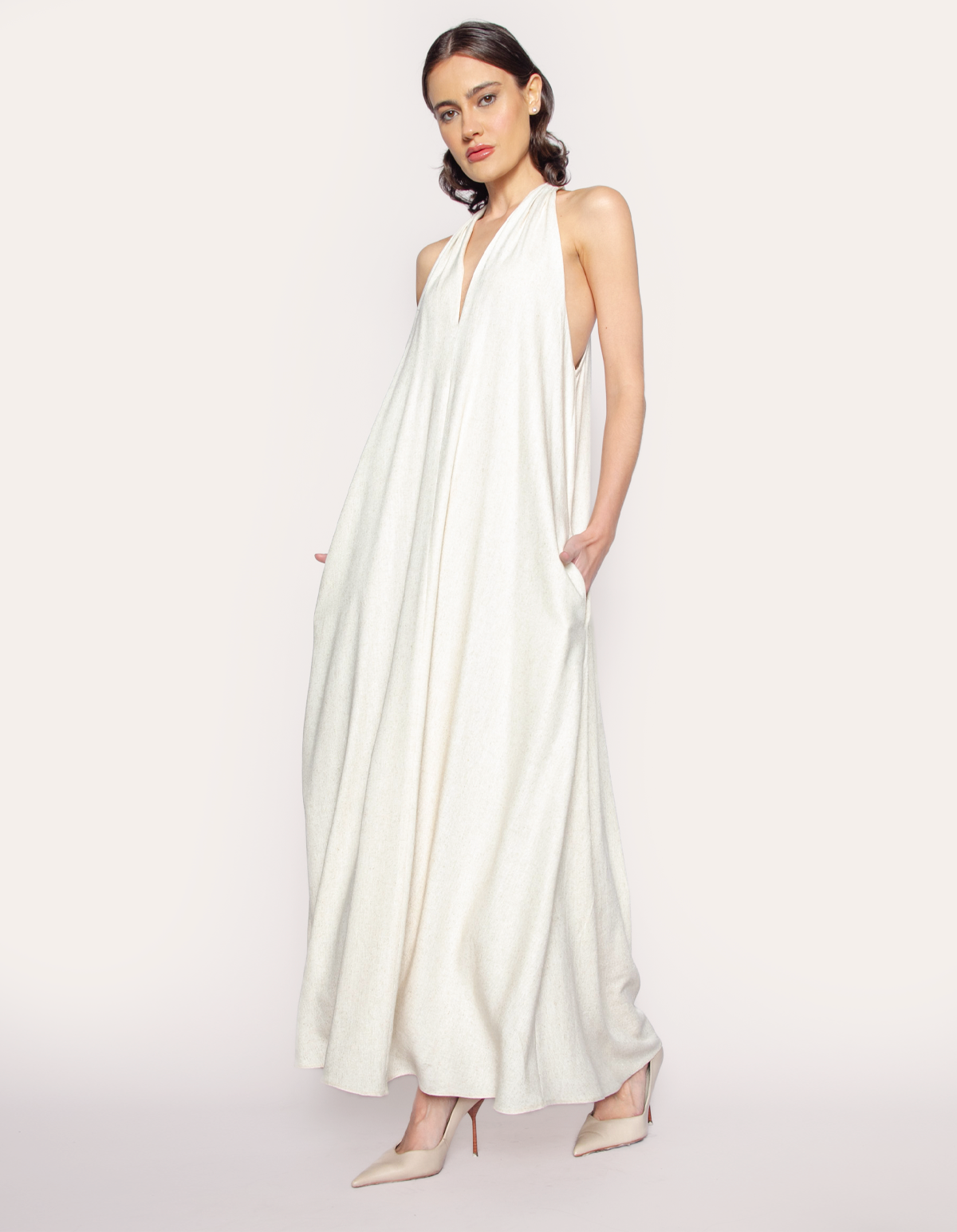 Vestido longo com modelagem ampla, decote V profundo, cava generosa e dois bolsos laterais funcionais.