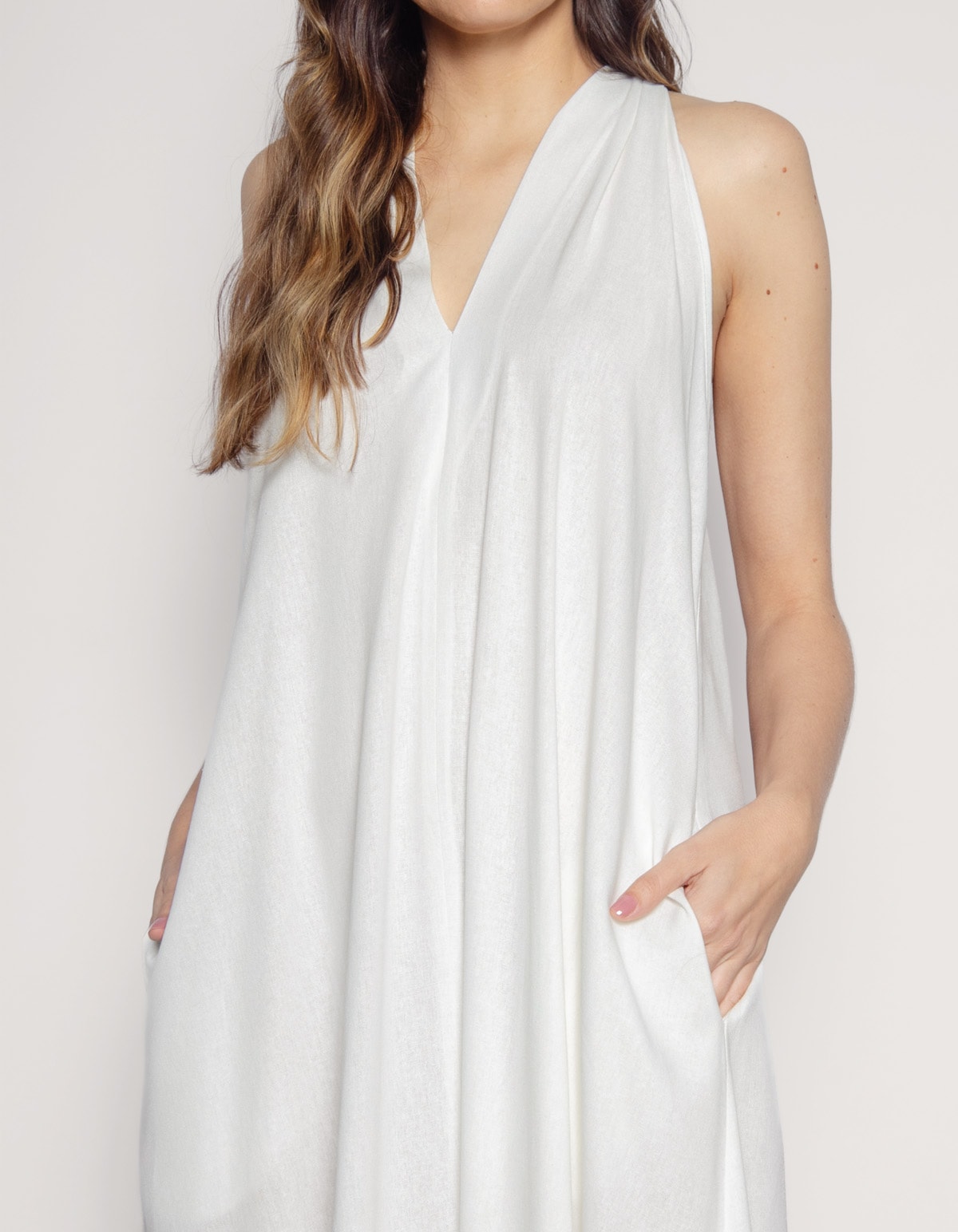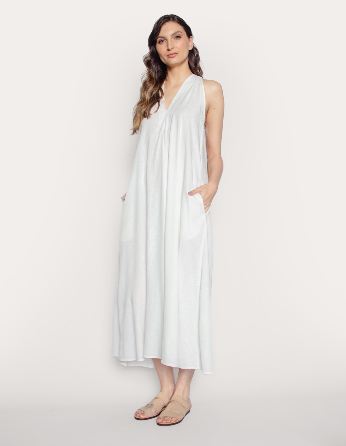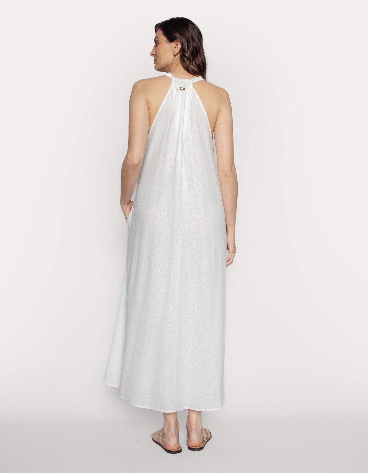 Vestido longo com modelagem ampla, decote V profundo, cava generosa e dois bolsos laterais funcionais.