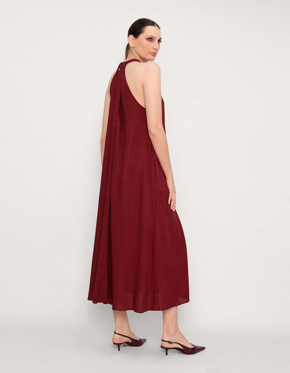 Vestido longo com modelagem ampla, decote V profundo, cava generosa e dois bolsos laterais funcionais.