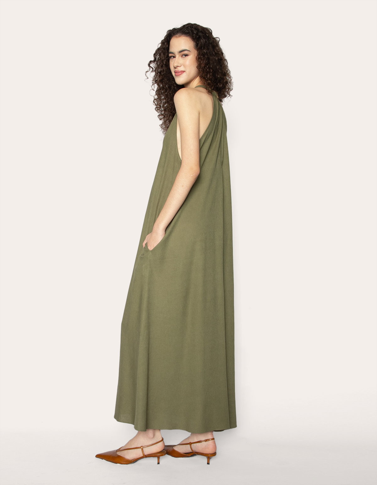Vestido longo com modelagem ampla, decote V profundo, cava generosa e dois bolsos laterais funcionais.