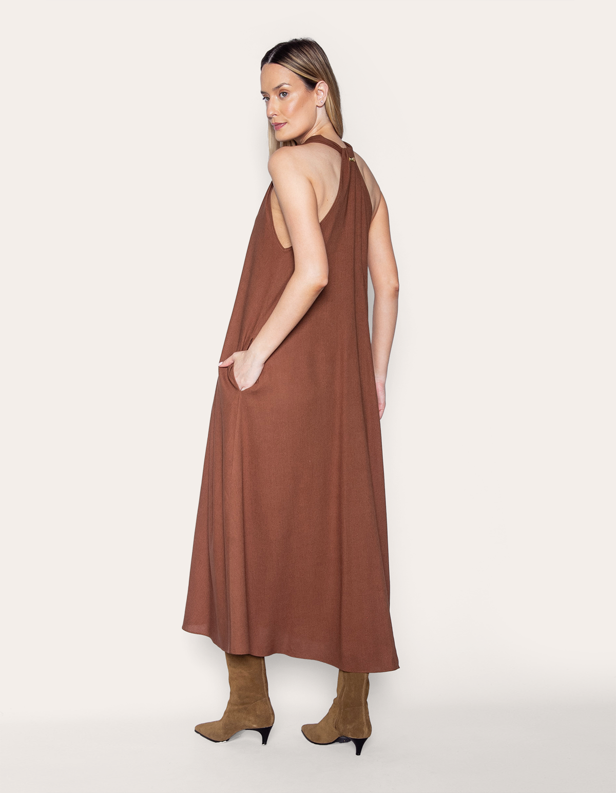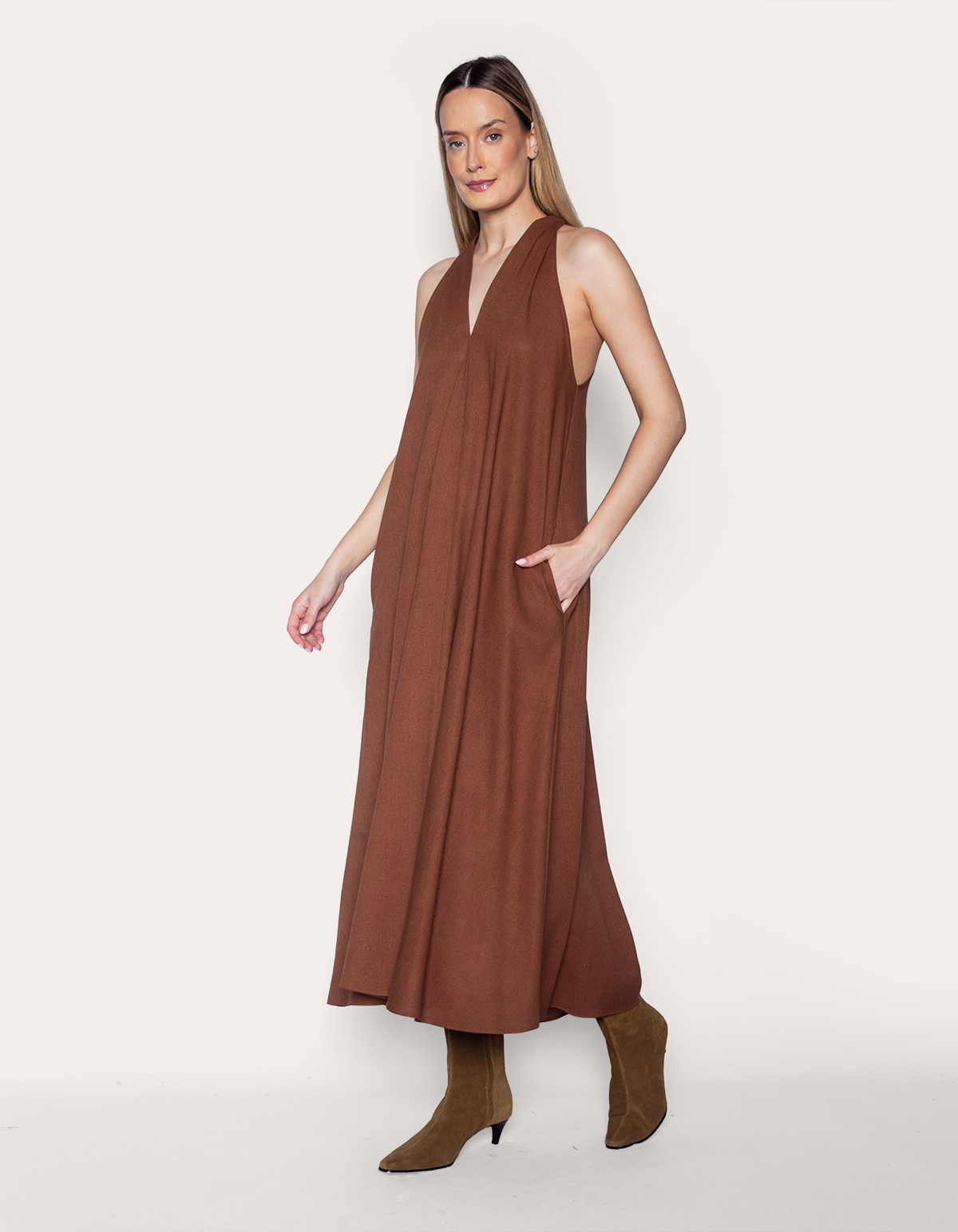 Vestido longo com modelagem ampla, decote V profundo, cava generosa e dois bolsos laterais funcionais.